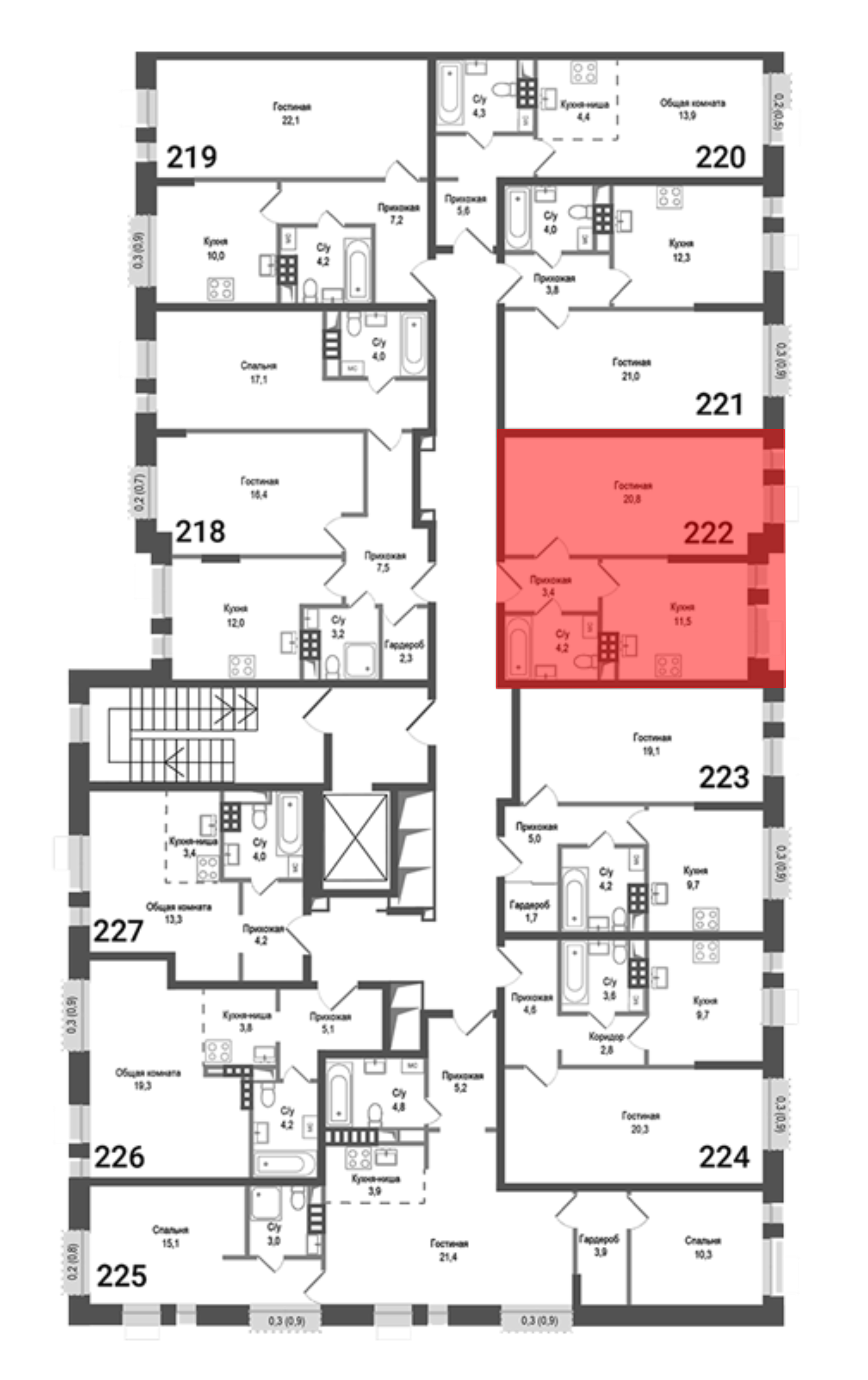 В проекте представлены различные типы квартир: от студий до 3-комнатных квартир. Планировки включают варианты с просторными кухнями-гостиными, мастер-спальнями, гардеробными комнатами и двухуровневыми квартирами на верхних этажах. Квартиры предлагаются без стен с высотой потолков до 5,42 м.