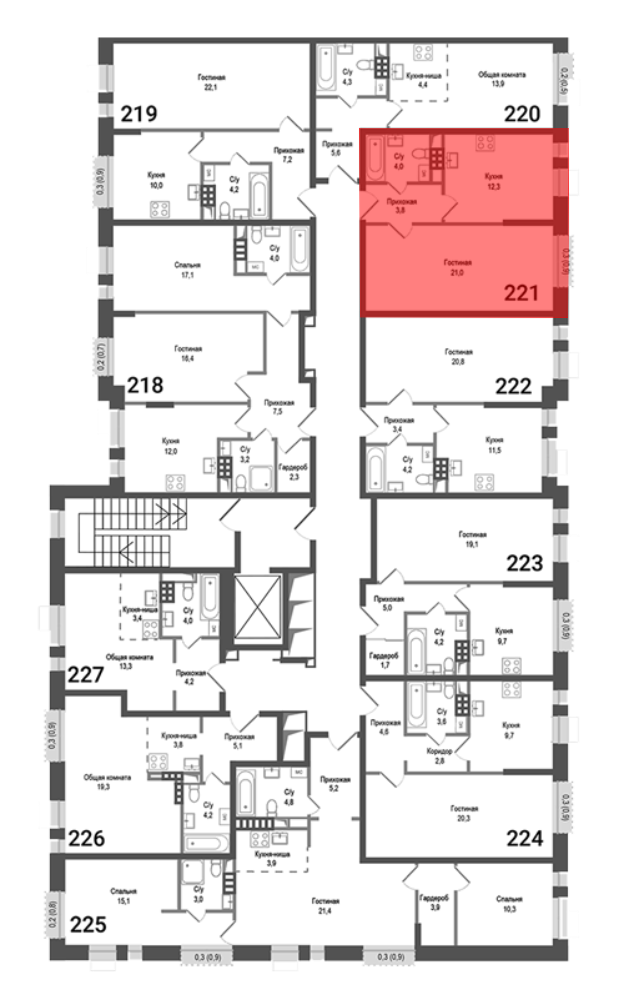 В проекте представлены различные типы квартир: от студий до 3-комнатных квартир. Планировки включают варианты с просторными кухнями-гостиными, мастер-спальнями, гардеробными комнатами и двухуровневыми квартирами на верхних этажах. Квартиры предлагаются без стен с высотой потолков до 5,42 м.