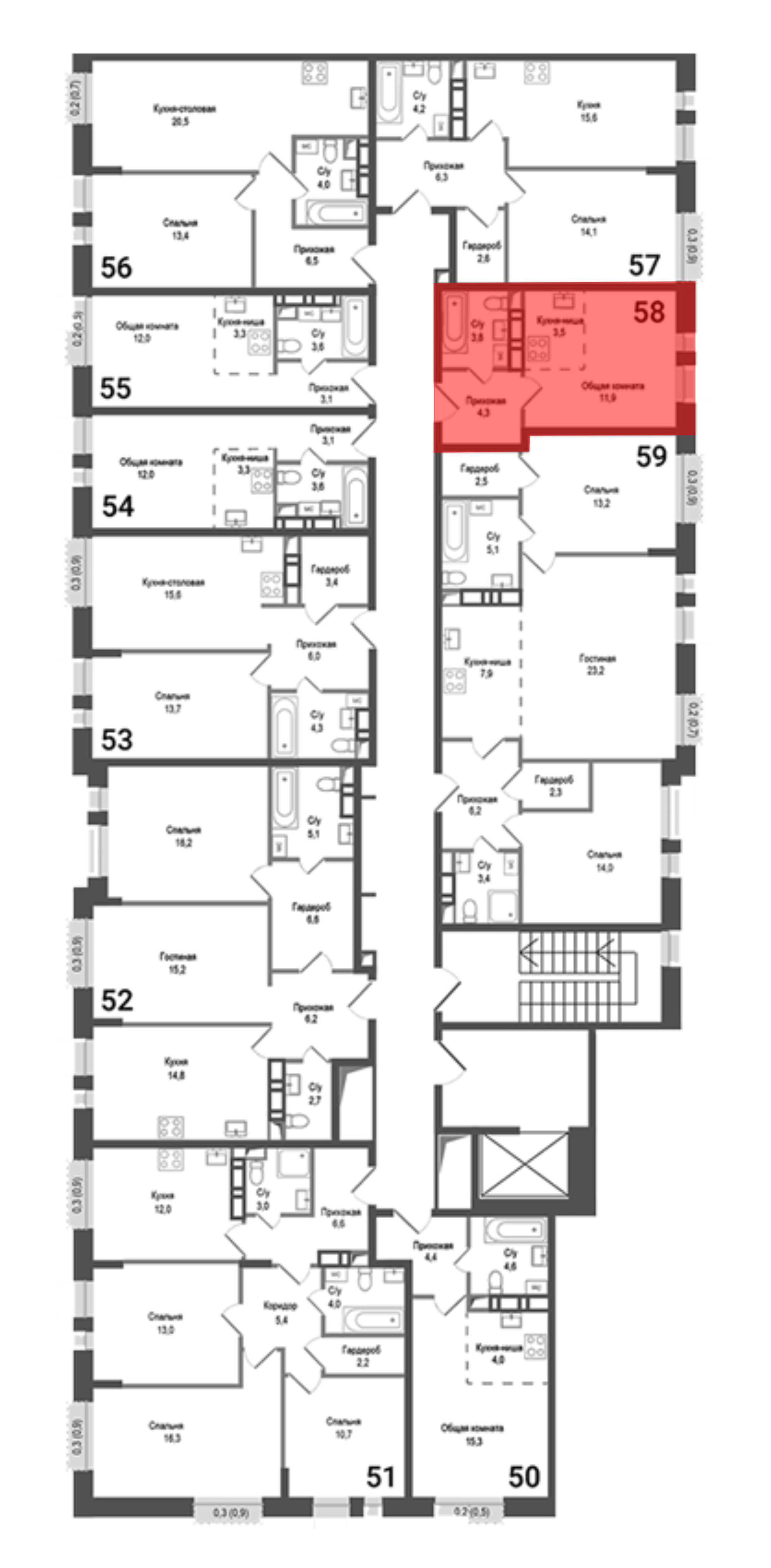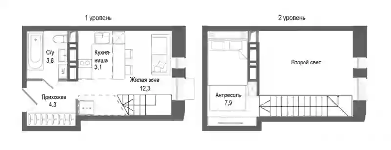 В проекте представлены различные типы квартир: от студий до 3-комнатных квартир. Планировки включают варианты с просторными кухнями-гостиными, мастер-спальнями, гардеробными комнатами и двухуровневыми квартирами на верхних этажах. Квартиры предлагаются без стен с высотой потолков до 5,42 м.