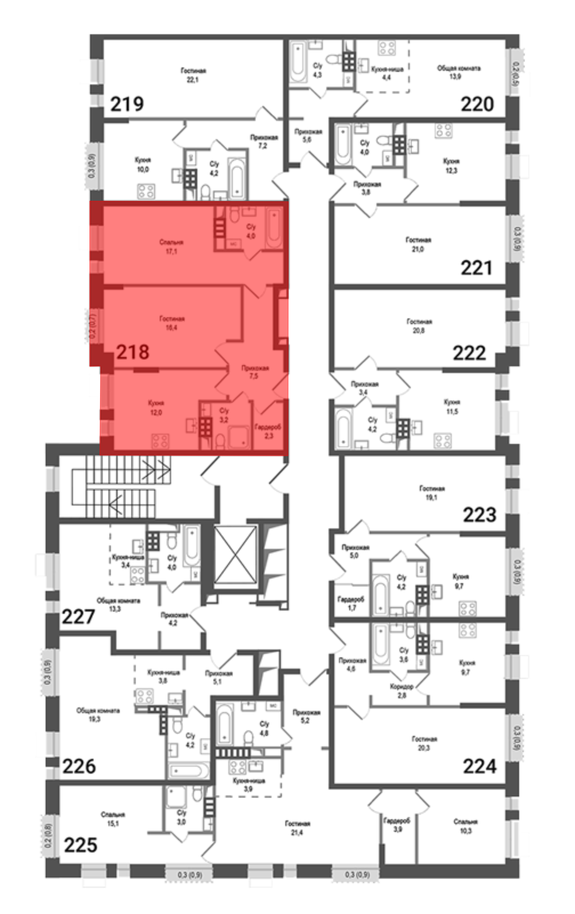 В проекте представлены различные типы квартир: от студий до 3-комнатных квартир. Планировки включают варианты с просторными кухнями-гостиными, мастер-спальнями, гардеробными комнатами и двухуровневыми квартирами на верхних этажах. Квартиры предлагаются без стен с высотой потолков до 5,42 м.