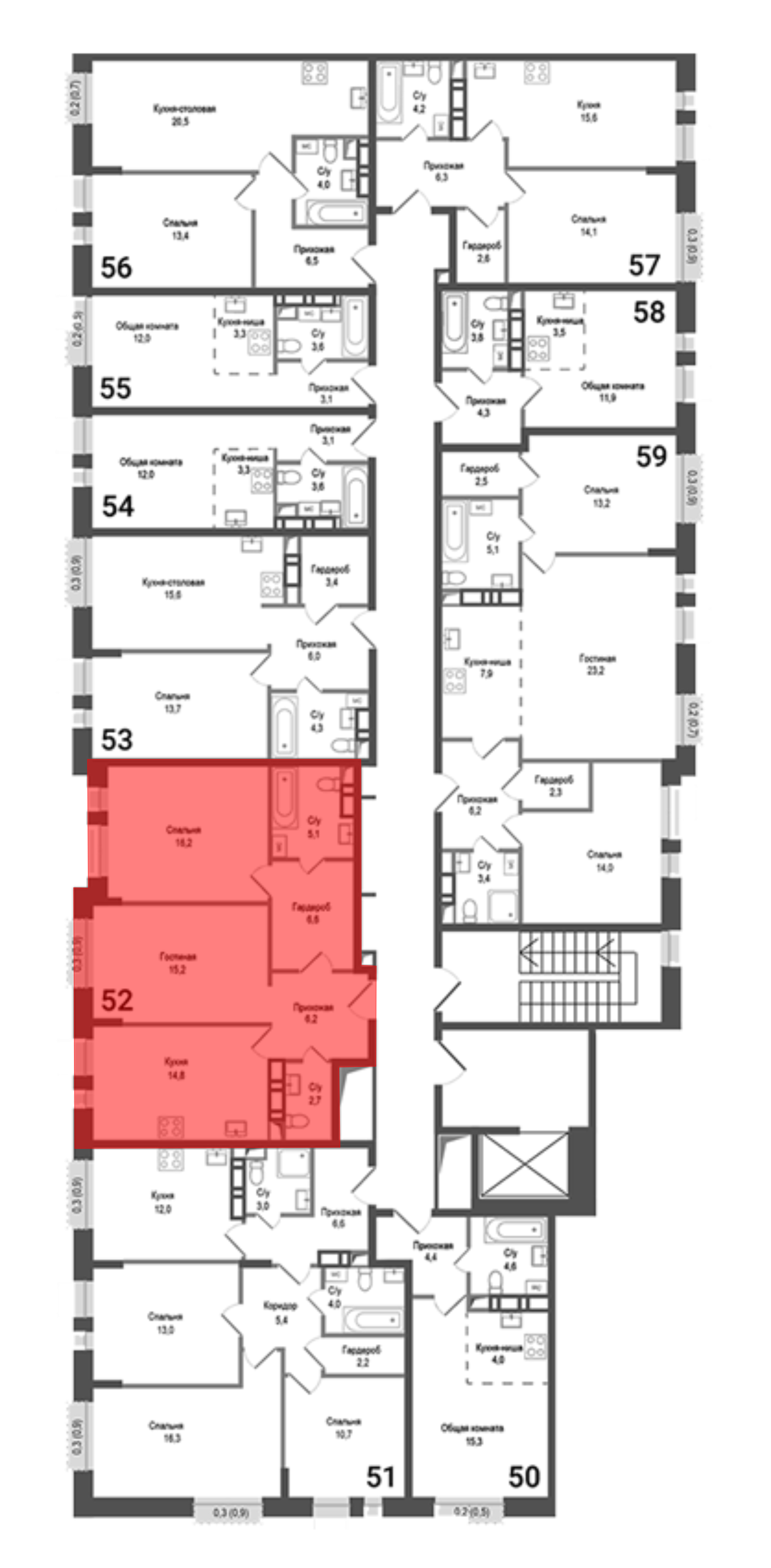 В проекте представлены различные типы квартир: от студий до 3-комнатных квартир. Планировки включают варианты с просторными кухнями-гостиными, мастер-спальнями, гардеробными комнатами и двухуровневыми квартирами на верхних этажах. Квартиры предлагаются без стен с высотой потолков до 5,42 м.