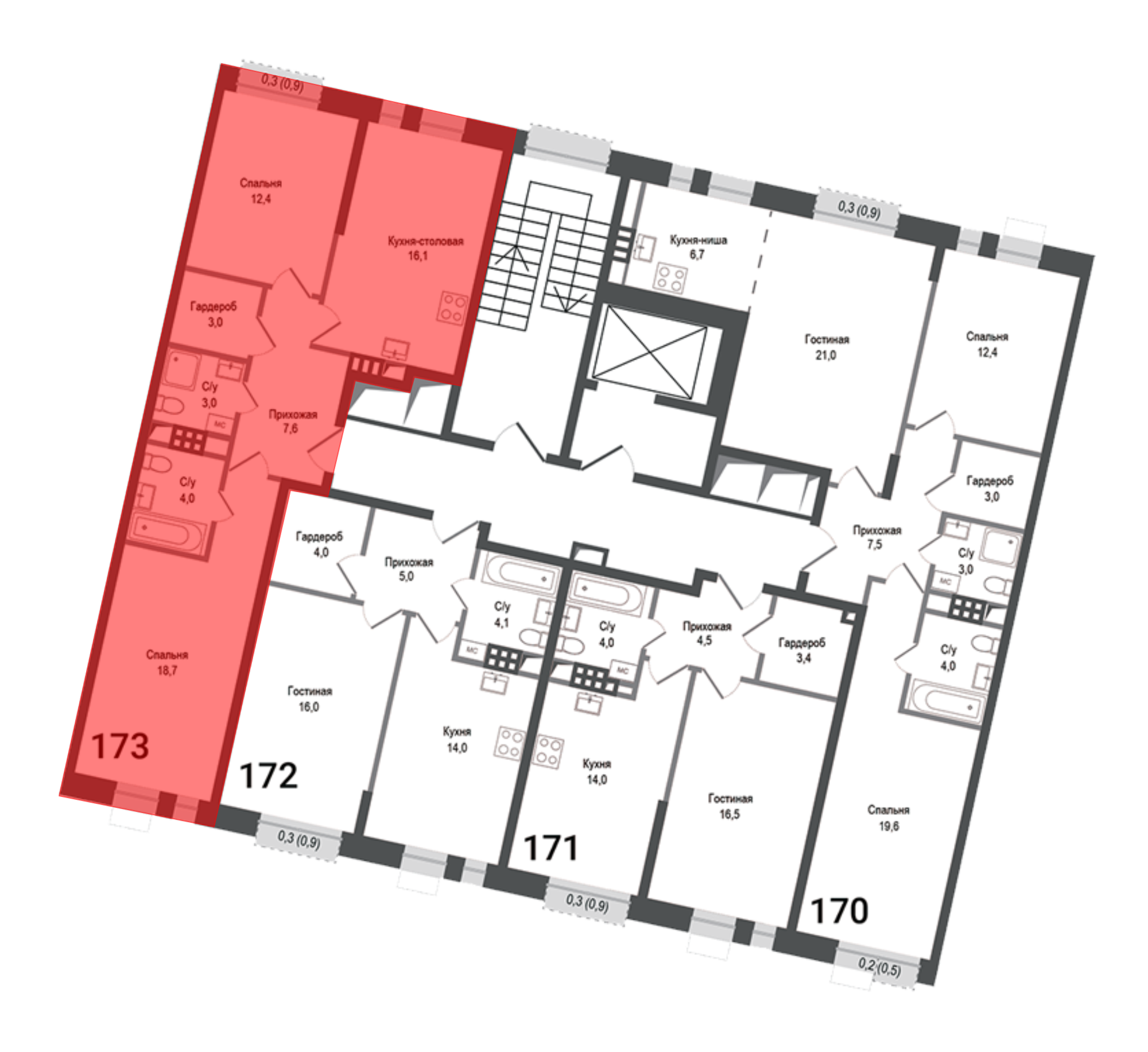В проекте представлены различные типы квартир: от студий до 3-комнатных квартир. Планировки включают варианты с просторными кухнями-гостиными, мастер-спальнями, гардеробными комнатами и двухуровневыми квартирами на верхних этажах. Квартиры предлагаются без стен с высотой потолков до 5,42 м.