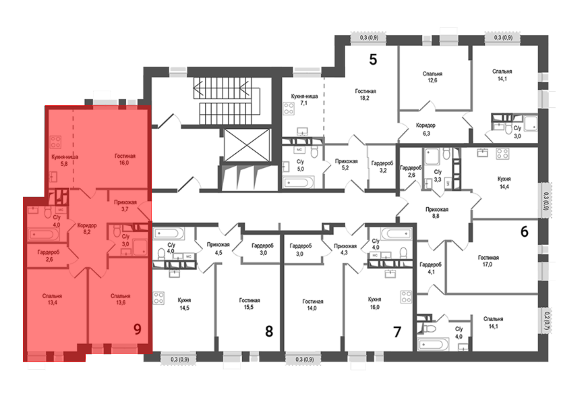 В проекте представлены различные типы квартир: от студий до 3-комнатных квартир. Планировки включают варианты с просторными кухнями-гостиными, мастер-спальнями, гардеробными комнатами и двухуровневыми квартирами на верхних этажах. Квартиры предлагаются без стен с высотой потолков до 5,42 м.