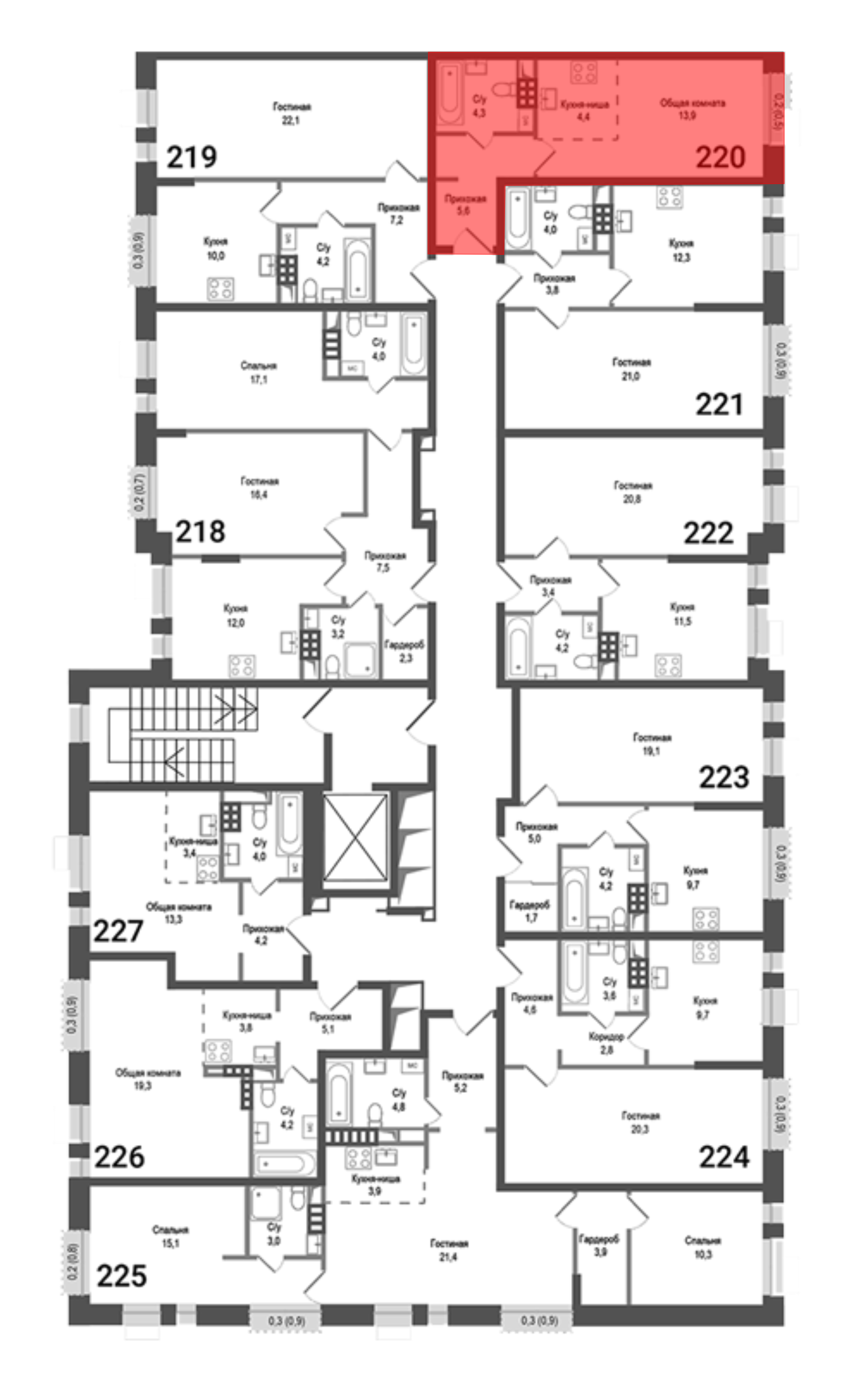 В проекте представлены различные типы квартир: от студий до 3-комнатных квартир. Планировки включают варианты с просторными кухнями-гостиными, мастер-спальнями, гардеробными комнатами и двухуровневыми квартирами на верхних этажах. Квартиры предлагаются без стен с высотой потолков до 5,42 м.