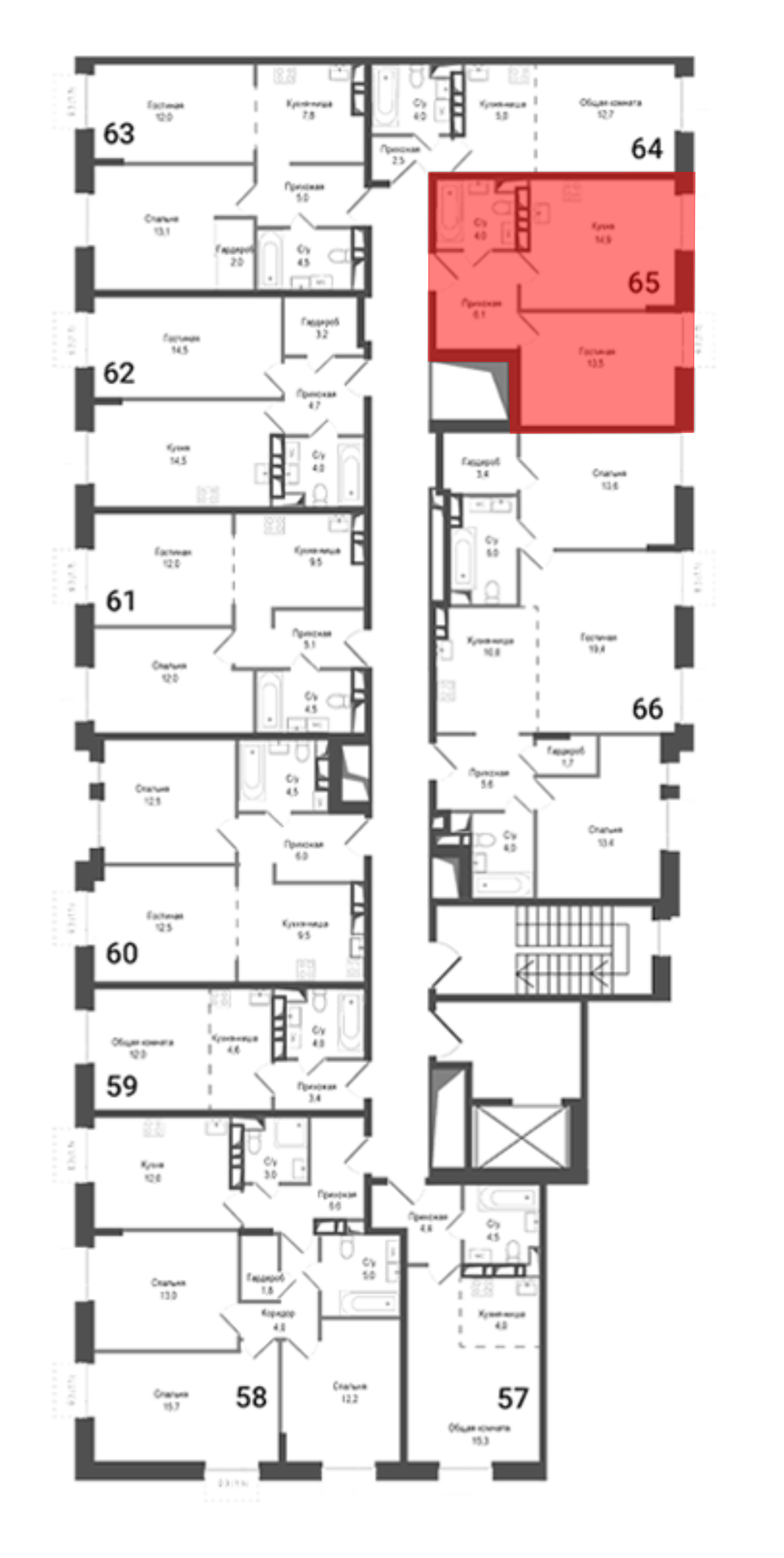 В проекте представлены различные типы квартир: от студий до 3-комнатных квартир. Планировки включают варианты с просторными кухнями-гостиными, мастер-спальнями, гардеробными комнатами и двухуровневыми квартирами на верхних этажах. Квартиры предлагаются без стен с высотой потолков до 5,42 м.