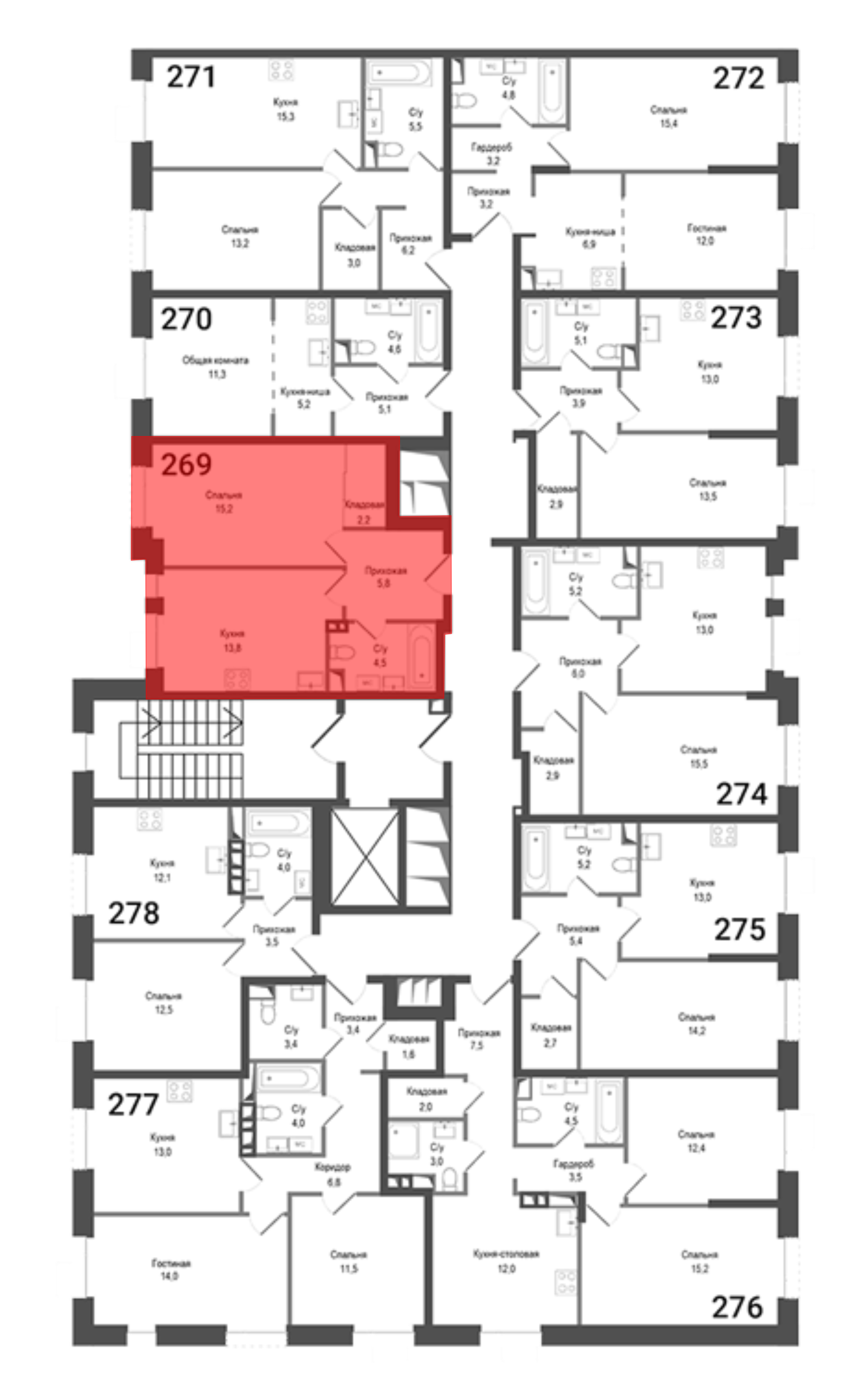 В проекте представлены различные типы квартир: от студий до 3-комнатных квартир. Планировки включают варианты с просторными кухнями-гостиными, мастер-спальнями, гардеробными комнатами и двухуровневыми квартирами на верхних этажах. Квартиры предлагаются без стен с высотой потолков до 5,42 м.