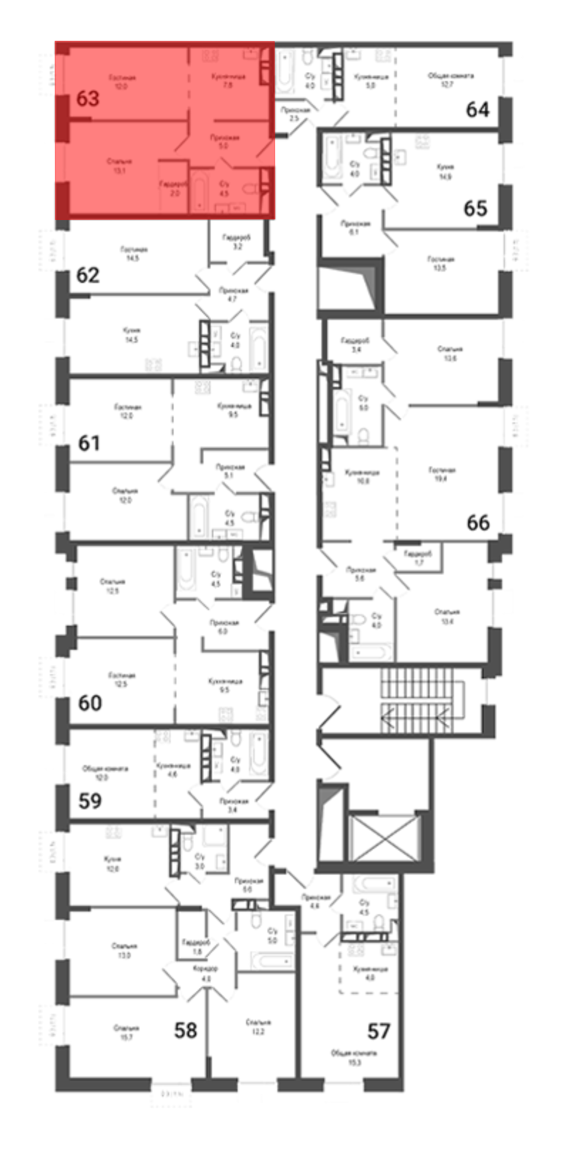 В проекте представлены различные типы квартир: от студий до 3-комнатных квартир. Планировки включают варианты с просторными кухнями-гостиными, мастер-спальнями, гардеробными комнатами и двухуровневыми квартирами на верхних этажах. Квартиры предлагаются без стен с высотой потолков до 5,42 м.