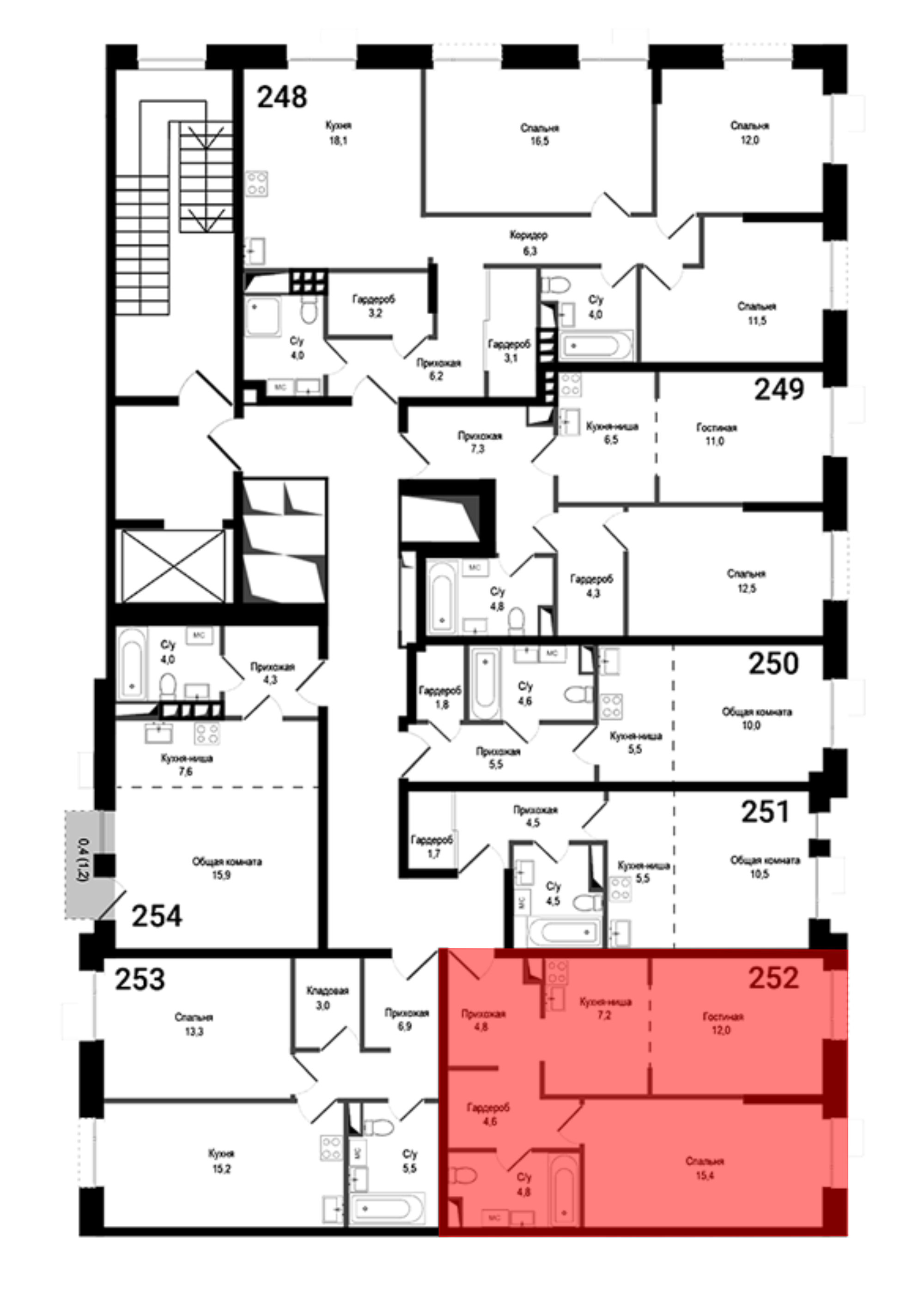 В проекте представлены различные типы квартир: от студий до 3-комнатных квартир. Планировки включают варианты с просторными кухнями-гостиными, мастер-спальнями, гардеробными комнатами и двухуровневыми квартирами на верхних этажах. Квартиры предлагаются без стен с высотой потолков до 5,42 м.