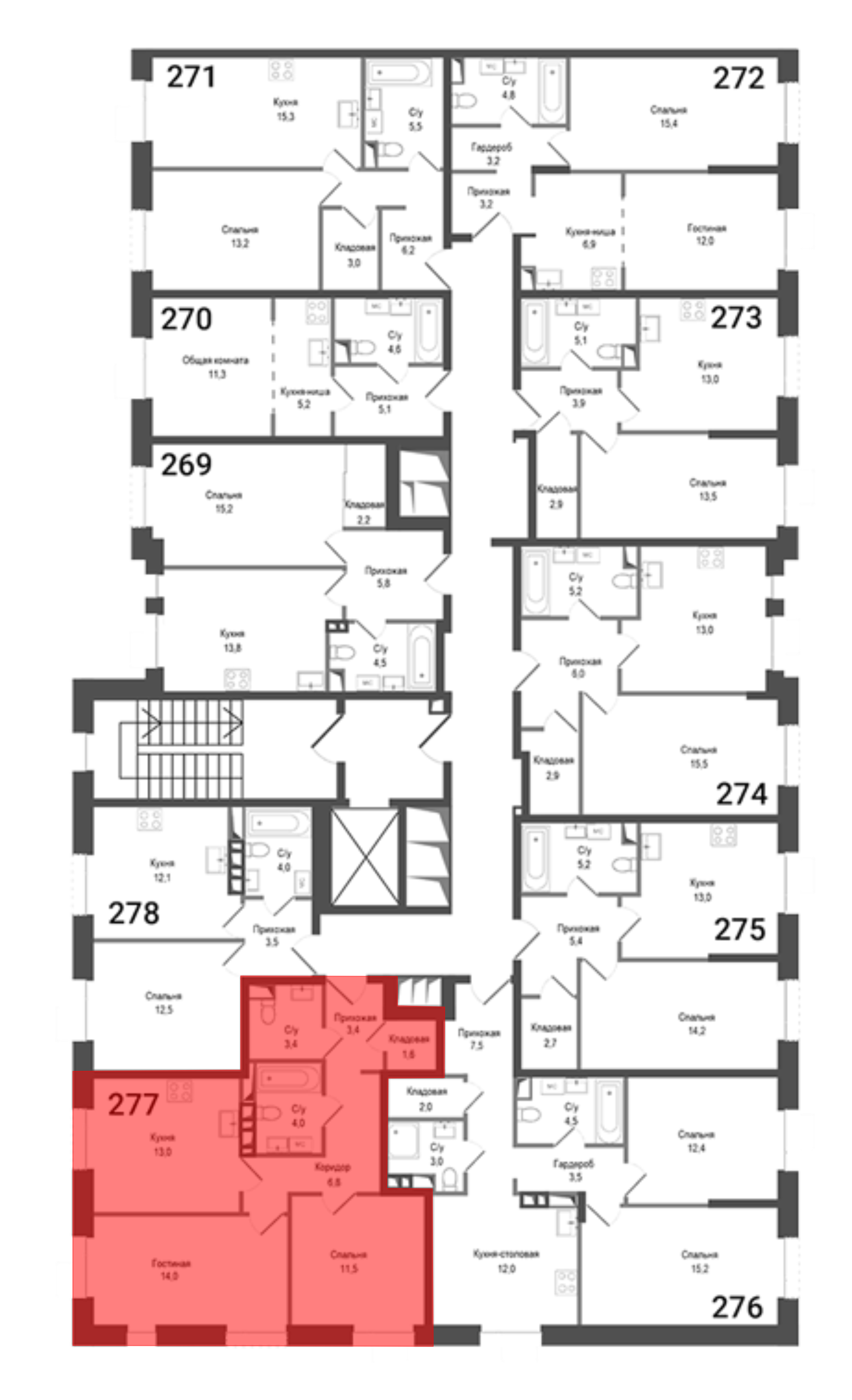 В проекте представлены различные типы квартир: от студий до 3-комнатных квартир. Планировки включают варианты с просторными кухнями-гостиными, мастер-спальнями, гардеробными комнатами и двухуровневыми квартирами на верхних этажах. Квартиры предлагаются без стен с высотой потолков до 5,42 м.