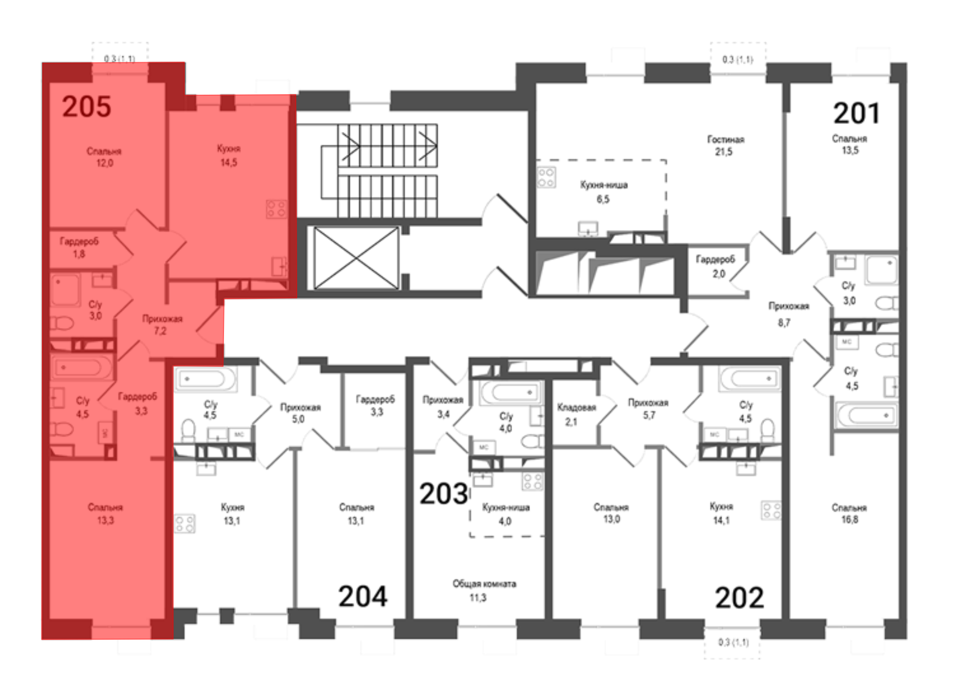 В проекте представлены различные типы квартир: от студий до 3-комнатных квартир. Планировки включают варианты с просторными кухнями-гостиными, мастер-спальнями, гардеробными комнатами и двухуровневыми квартирами на верхних этажах. Квартиры предлагаются без стен с высотой потолков до 5,42 м.