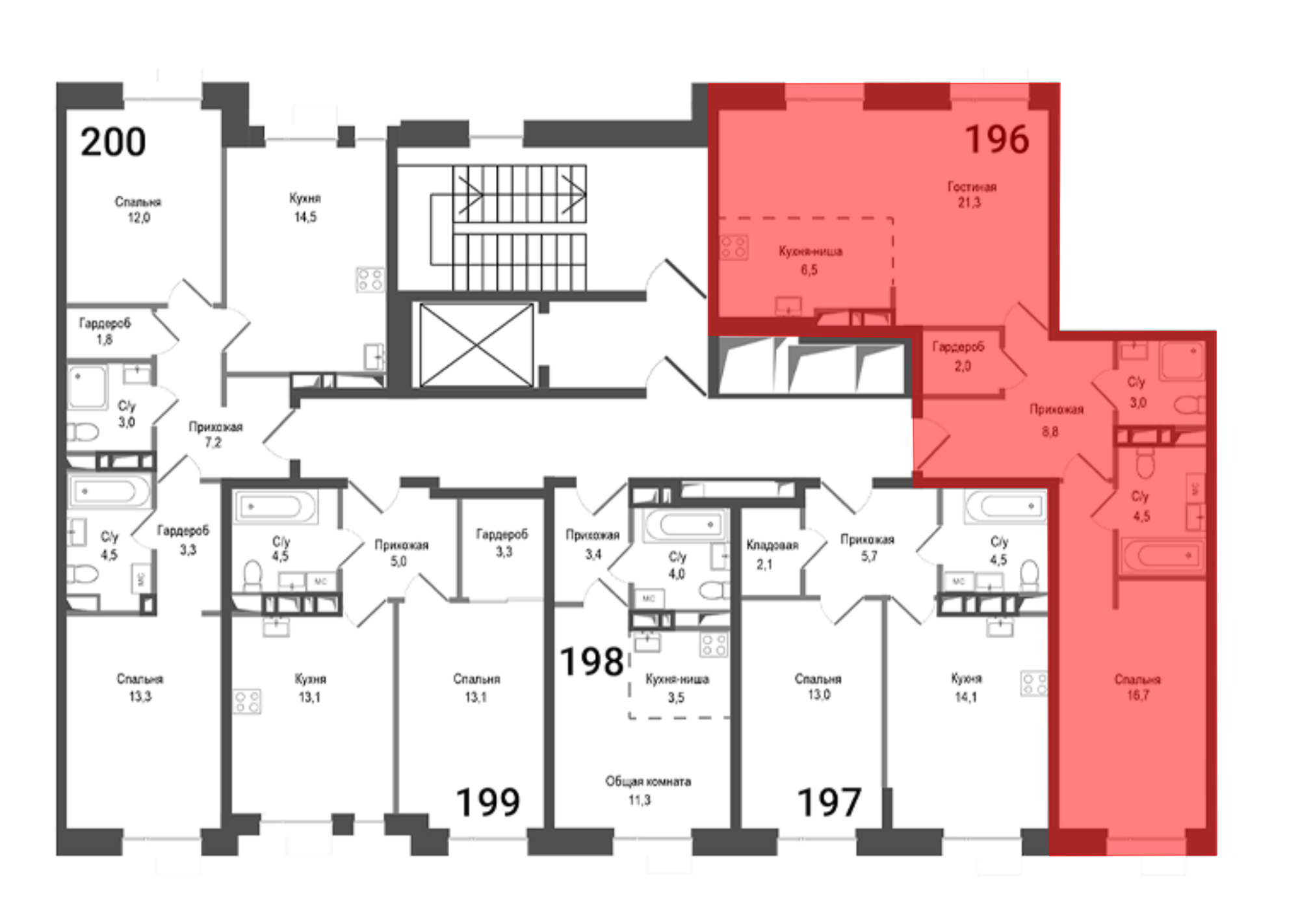 В проекте представлены различные типы квартир: от студий до 3-комнатных квартир. Планировки включают варианты с просторными кухнями-гостиными, мастер-спальнями, гардеробными комнатами и двухуровневыми квартирами на верхних этажах. Квартиры предлагаются без стен с высотой потолков до 5,42 м.