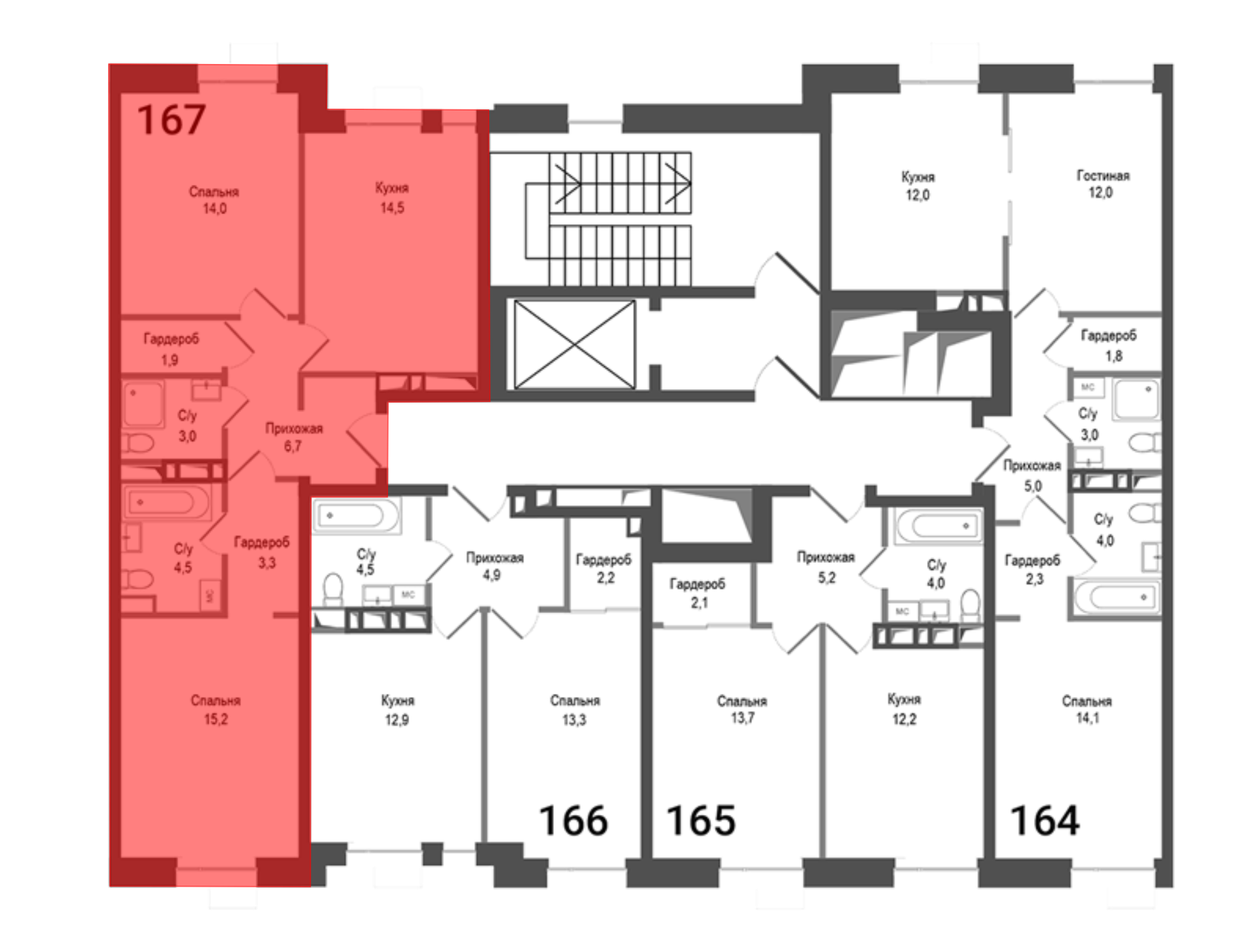 В проекте представлены различные типы квартир: от студий до 3-комнатных квартир. Планировки включают варианты с просторными кухнями-гостиными, мастер-спальнями, гардеробными комнатами и двухуровневыми квартирами на верхних этажах. Квартиры предлагаются без стен с высотой потолков до 5,42 м.