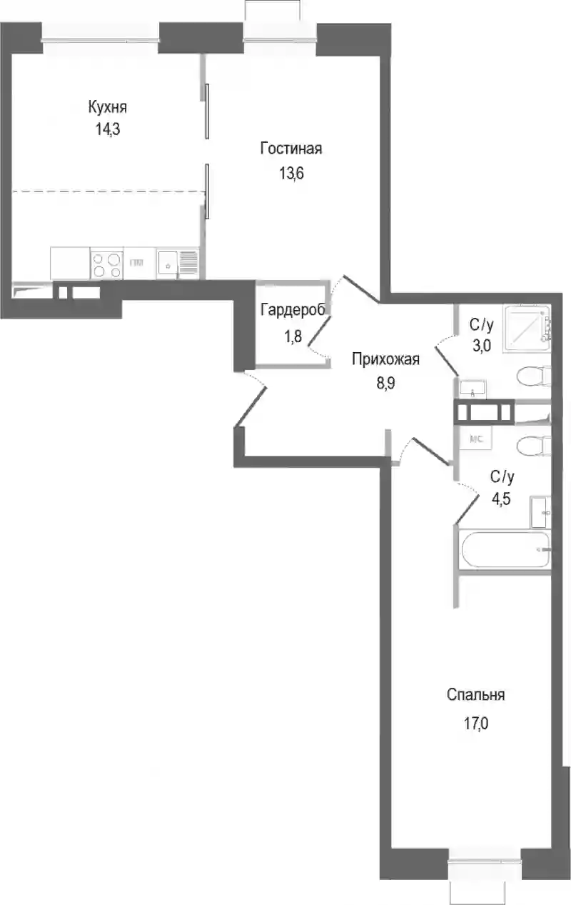 9 170 800 ₽2-к.квартира, 45.4 м², 2 эт.