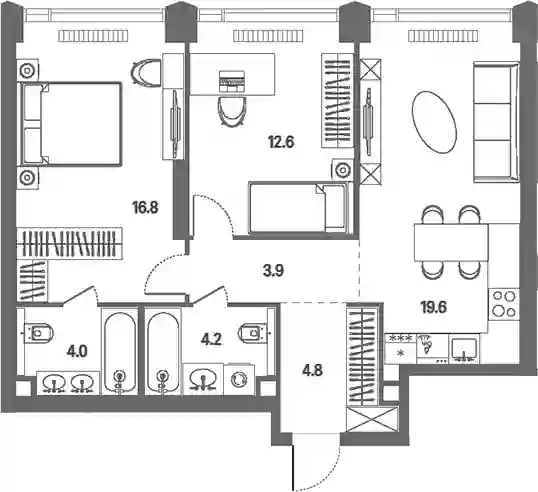 Планировочные решения включают разнообразные форматы квартир, рассчитанные на разный образ жизни: от 28 до 383 кв. м с потолками от 3 м. Квартиры представлены без внутренних стен, позволяя реализовать собственные дизайнерские решения. Разработка проекта ведется с учетом поэтапного ввода: на первом этапе возводятся 2 корпуса на 807 квартир с продуманными планировками и инженерными узлами.