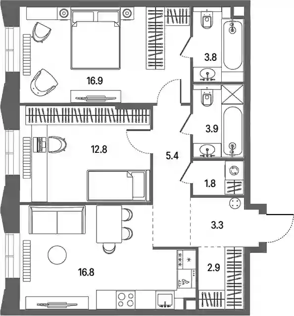 Планировочные решения включают разнообразные форматы квартир, рассчитанные на разный образ жизни: от 28 до 383 кв. м с потолками от 3 м. Квартиры представлены без внутренних стен, позволяя реализовать собственные дизайнерские решения. Разработка проекта ведется с учетом поэтапного ввода: на первом этапе возводятся 2 корпуса на 807 квартир с продуманными планировками и инженерными узлами.