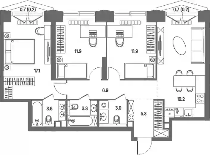 Планировочные решения включают разнообразные форматы квартир, рассчитанные на разный образ жизни: от 28 до 383 кв. м с потолками от 3 м. Квартиры представлены без внутренних стен, позволяя реализовать собственные дизайнерские решения. Разработка проекта ведется с учетом поэтапного ввода: на первом этапе возводятся 2 корпуса на 807 квартир с продуманными планировками и инженерными узлами.
