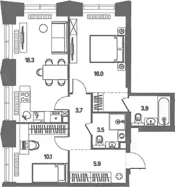Планировочные решения включают разнообразные форматы квартир, рассчитанные на разный образ жизни: от 28 до 383 кв. м с потолками от 3 м. Квартиры представлены без внутренних стен, позволяя реализовать собственные дизайнерские решения. Разработка проекта ведется с учетом поэтапного ввода: на первом этапе возводятся 2 корпуса на 807 квартир с продуманными планировками и инженерными узлами.