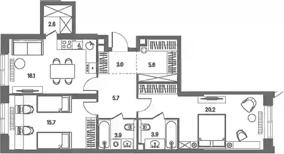 Планировочные решения включают разнообразные форматы квартир, рассчитанные на разный образ жизни: от 28 до 383 кв. м с потолками от 3 м. Квартиры представлены без внутренних стен, позволяя реализовать собственные дизайнерские решения. Разработка проекта ведется с учетом поэтапного ввода: на первом этапе возводятся 2 корпуса на 807 квартир с продуманными планировками и инженерными узлами.