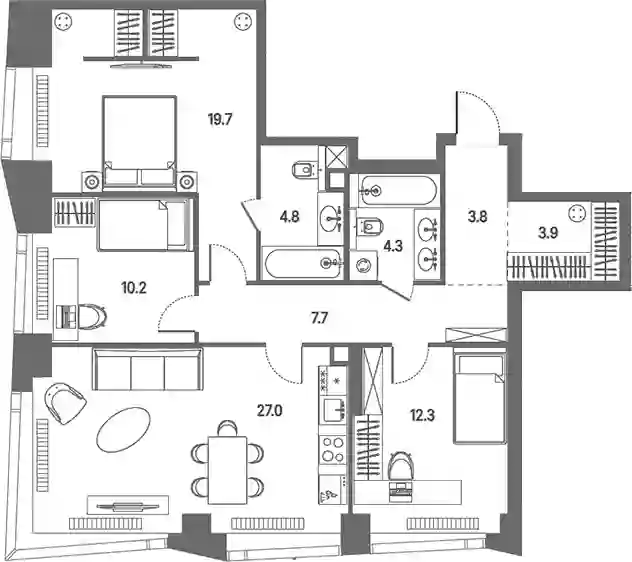 Планировочные решения включают разнообразные форматы квартир, рассчитанные на разный образ жизни: от 28 до 383 кв. м с потолками от 3 м. Квартиры представлены без внутренних стен, позволяя реализовать собственные дизайнерские решения. Разработка проекта ведется с учетом поэтапного ввода: на первом этапе возводятся 2 корпуса на 807 квартир с продуманными планировками и инженерными узлами.