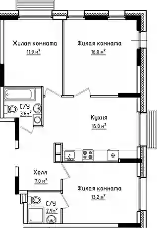В проекте представлены студии и квартиры с 1–3 спальнями, а также европланировки. Помещения идут с потолками от 3 до 3,3 метров. В увеличенных оконных проемах установлены двухкамерные стеклопакеты из усиленного ПВХ-профиля. В квартирах выполнена чистовая отделка: на выбор предлагаются светлая и темная палитры. Пространства готовы к финальному обустройству и заселению.