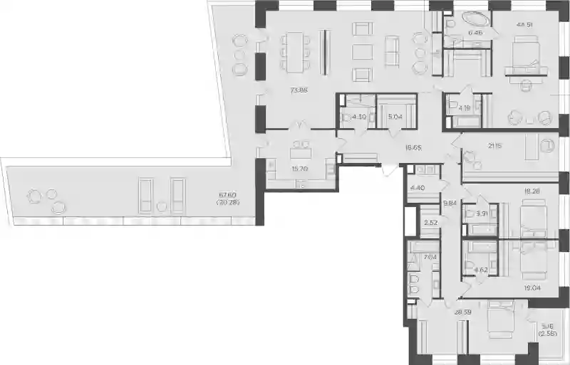 В проекте представлено множество планировочных решений — от студий до просторных 4х-комнатных квартир. Все лоты сдаются с базовой отделкой, высотой потолков до 3,16 метров и стандартными окнами. Предусмотрены квартиры с мастер-спальнями и гардеробными.
