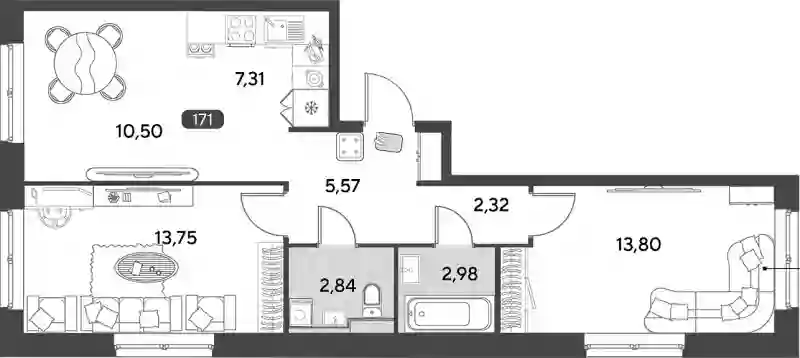 В проекте представлены планировочные решения различной комнатности. Все лоты сдаются с высотой потолков 2.7 метра и без отделки.