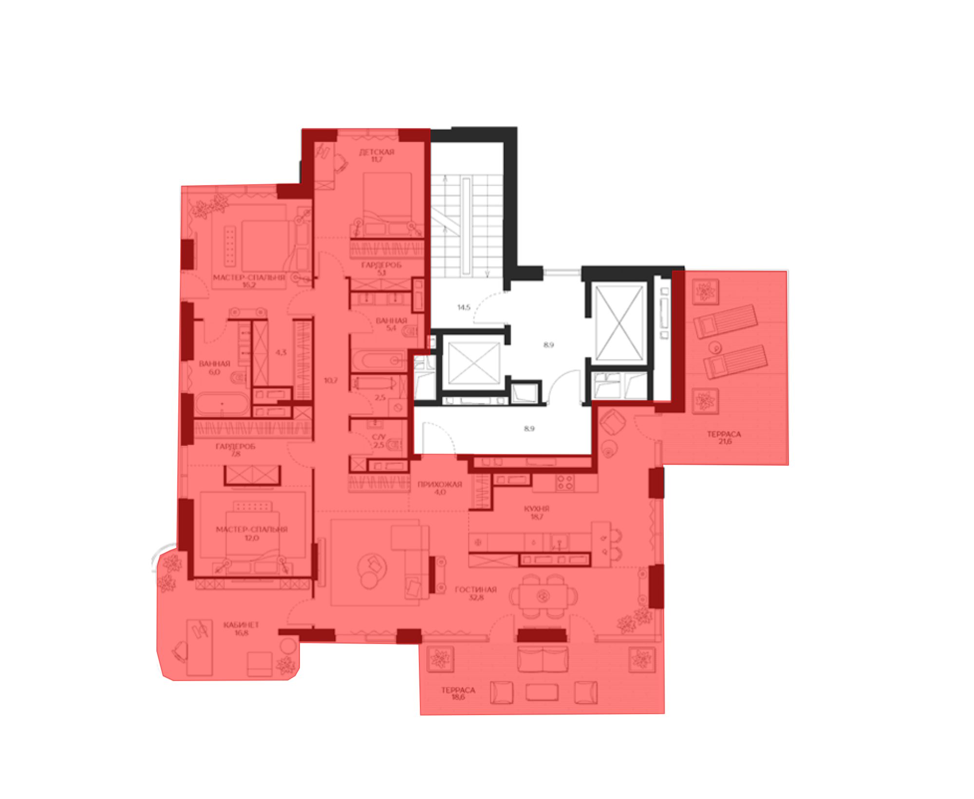 В комплексе представлены квартиры от студий до планировок с 4 спальнями. Квартиры сдаются в формате без стен, что позволяет гибко адаптировать пространство под индивидуальные потребности. Предусмотрены мастер-спальни с отдельными ванными и гардеробными, просторные кухни-гостиные, кабинеты и хозяйственные помещения. Некоторые варианты включают несколько санузлов и отдельные кладовые. В проекте также есть квартиры с балконами и эркерами, а пентхаусы дополнены просторными террасами.