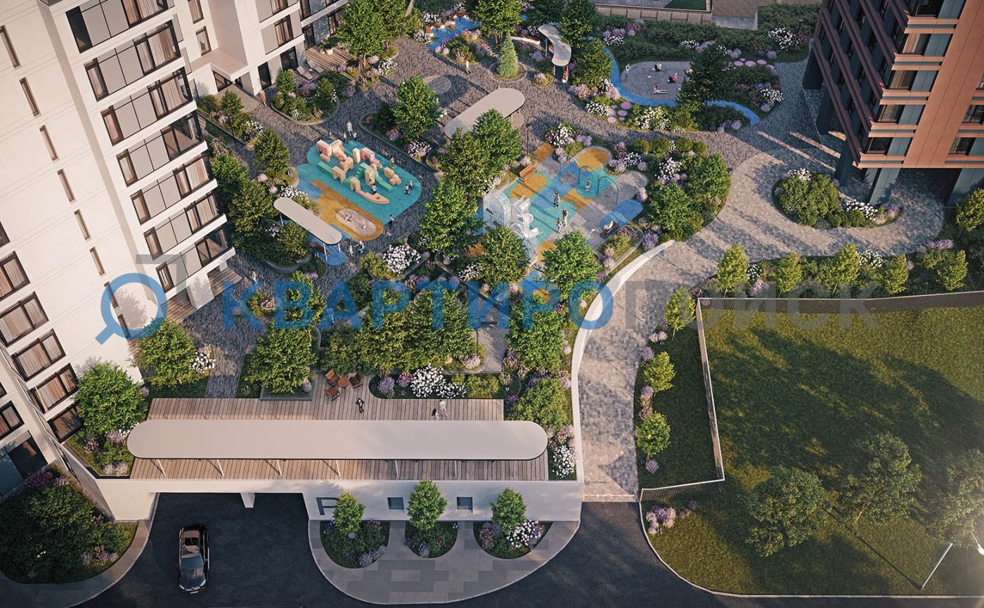 На территории комплекса расположен приватный двор-парк с ландшафтным дизайном и озеленением по принципу всесезонного сада. Обустроены детские и спортивные площадки, йога-зоны, укромные зоны для чтения и отдыха. Все дорожки оборудованы системой подогрева, а территория находится под круглосуточным видеонаблюдением. Для автомобилей предусмотрен подземный паркинг на 87 машиномест, включая места для электромобилей и гостевые парковки. Внутри комплекса предусмотрены колясочные, мойка лап для питомцев, зона хранения посылок.