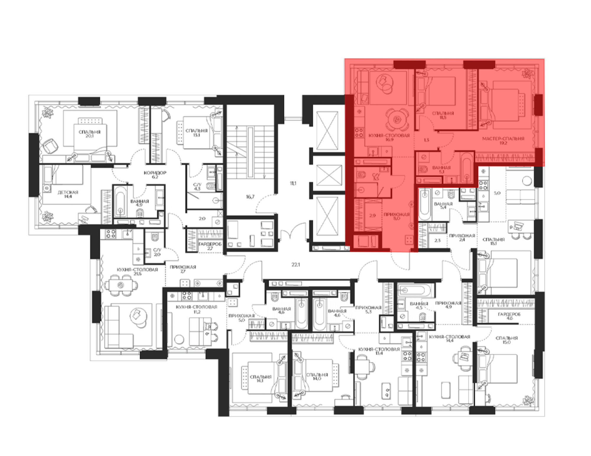 В комплексе представлены квартиры от студий до планировок с 4 спальнями. Квартиры сдаются в формате без стен, что позволяет гибко адаптировать пространство под индивидуальные потребности. Предусмотрены мастер-спальни с отдельными ванными и гардеробными, просторные кухни-гостиные, кабинеты и хозяйственные помещения. Некоторые варианты включают несколько санузлов и отдельные кладовые. В проекте также есть квартиры с балконами и эркерами, а пентхаусы дополнены просторными террасами.