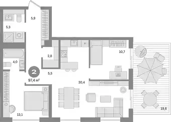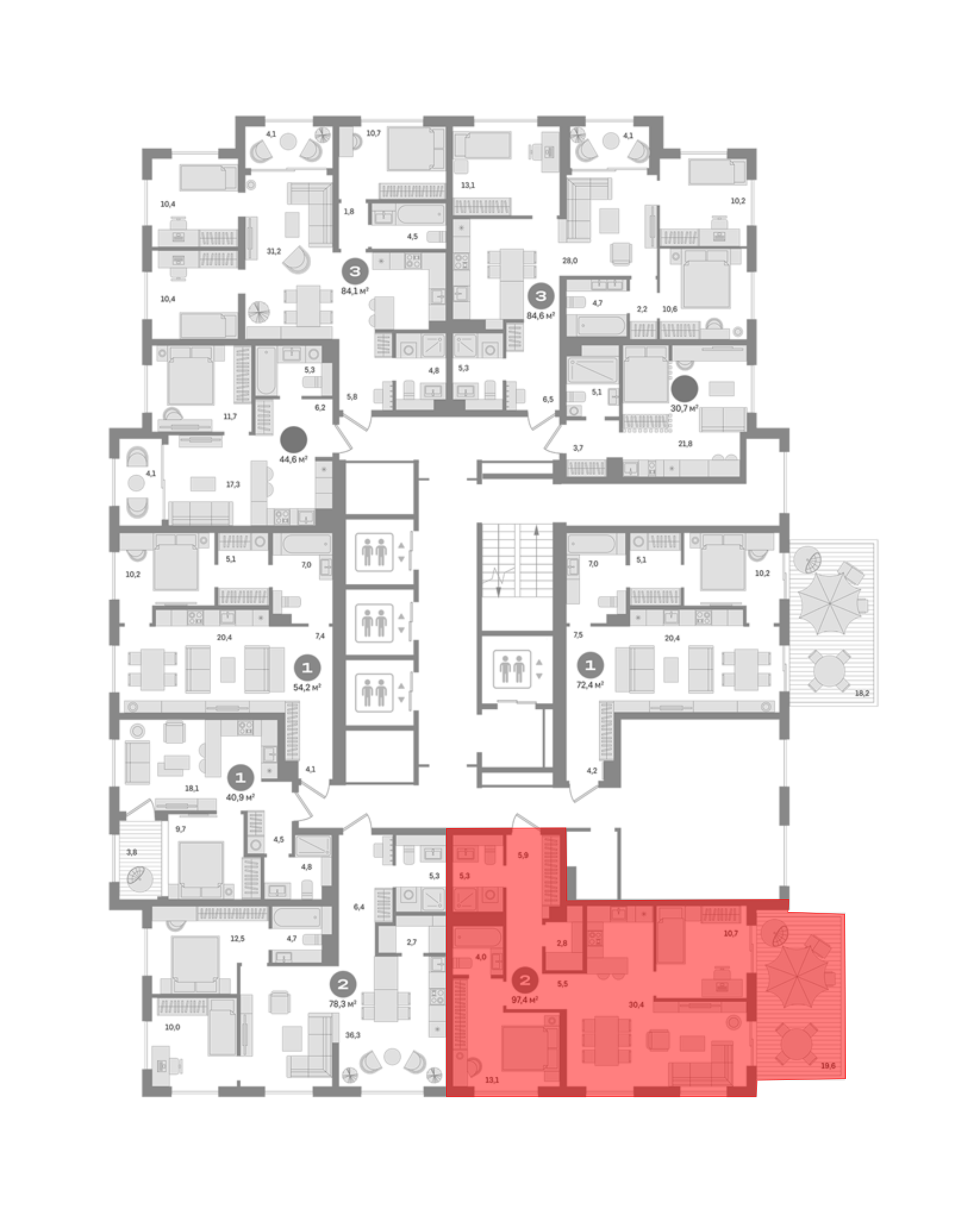 В проекте предложено 50 вариантов планировочных решений. На первых и последних этажах — уникальные форматы: с террасами, отдельным входом, двухуровневые. Их всего 126. На последних этажах башен предложены квартиры со вторым светом, несколькими террасами, бассейном, сауной, дымоходом под камин, помещениями под зимний сад. Все квартиры сдаются с подчистовой отделкой.
