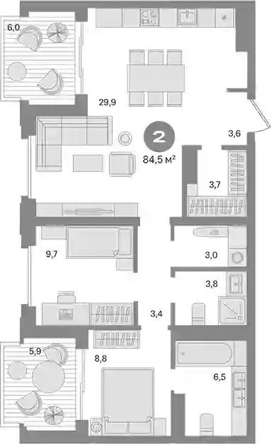 В проекте предложено 50 вариантов планировочных решений. На первых и последних этажах — уникальные форматы: с террасами, отдельным входом, двухуровневые. Их всего 126. На последних этажах башен предложены квартиры со вторым светом, несколькими террасами, бассейном, сауной, дымоходом под камин, помещениями под зимний сад. Все квартиры сдаются с подчистовой отделкой.