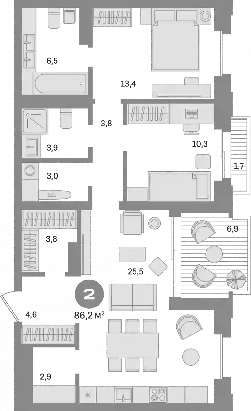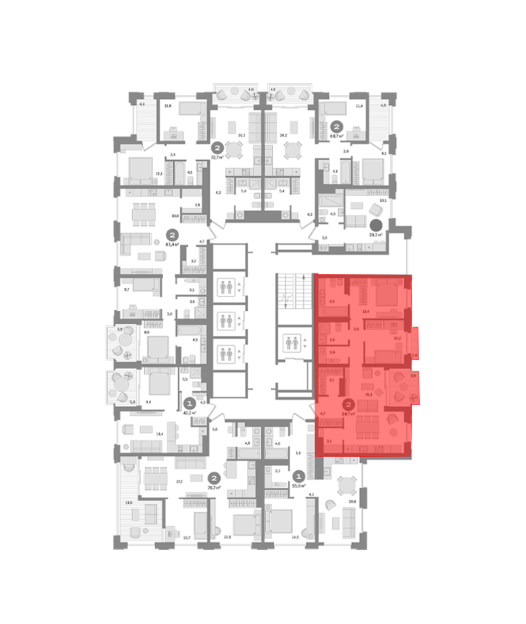 В проекте предложено 50 вариантов планировочных решений. На первых и последних этажах — уникальные форматы: с террасами, отдельным входом, двухуровневые. Их всего 126. На последних этажах башен предложены квартиры со вторым светом, несколькими террасами, бассейном, сауной, дымоходом под камин, помещениями под зимний сад. Все квартиры сдаются с подчистовой отделкой.