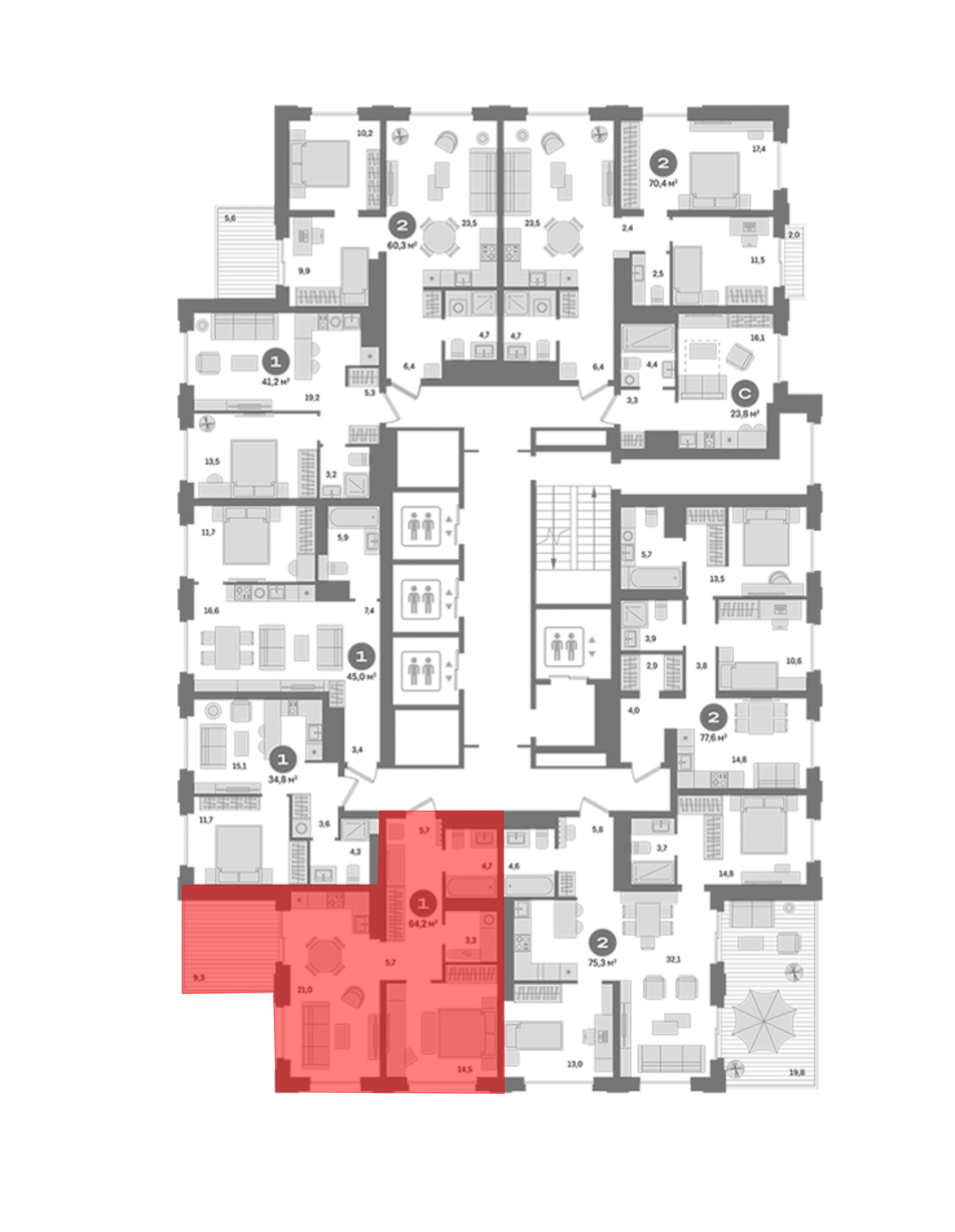 В проекте предложено 50 вариантов планировочных решений. На первых и последних этажах — уникальные форматы: с террасами, отдельным входом, двухуровневые. Их всего 126. На последних этажах башен предложены квартиры со вторым светом, несколькими террасами, бассейном, сауной, дымоходом под камин, помещениями под зимний сад. Все квартиры сдаются с подчистовой отделкой.