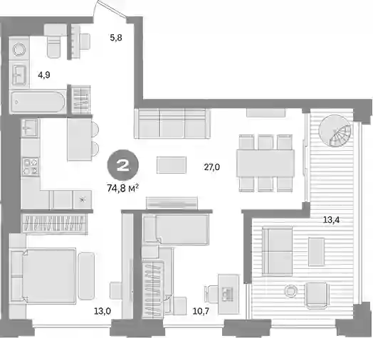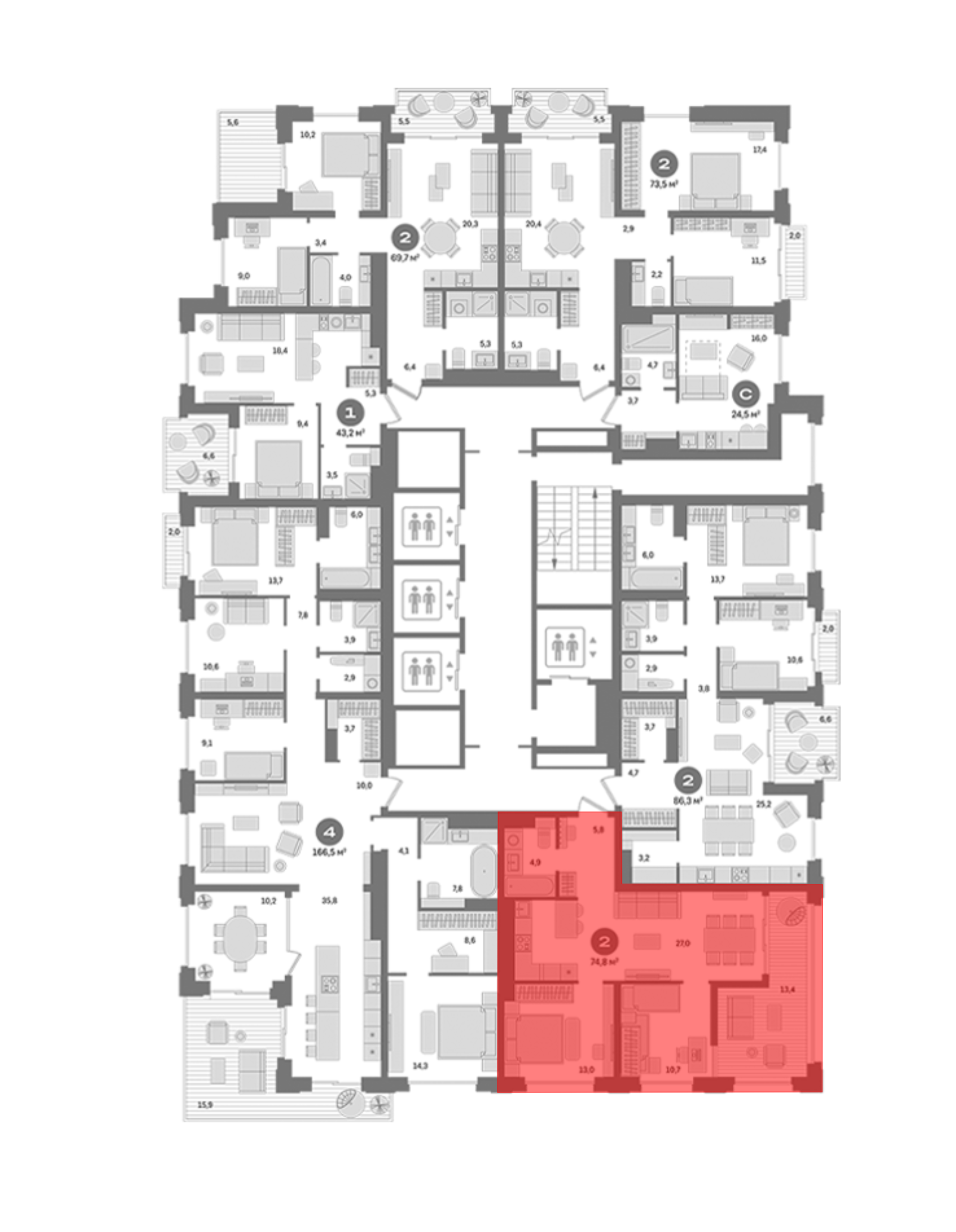 В проекте предложено 50 вариантов планировочных решений. На первых и последних этажах — уникальные форматы: с террасами, отдельным входом, двухуровневые. Их всего 126. На последних этажах башен предложены квартиры со вторым светом, несколькими террасами, бассейном, сауной, дымоходом под камин, помещениями под зимний сад. Все квартиры сдаются с подчистовой отделкой.