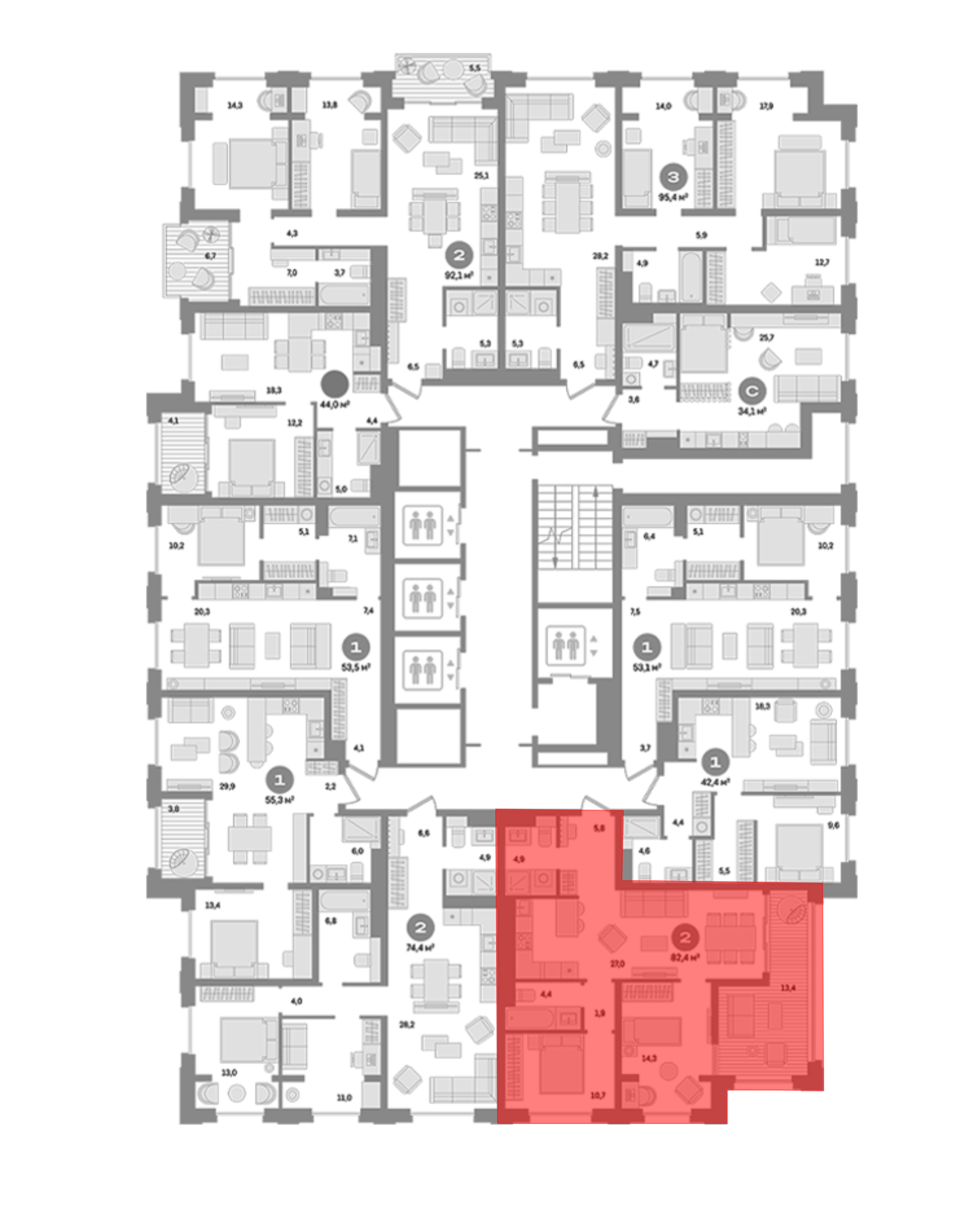 В проекте предложено 50 вариантов планировочных решений. На первых и последних этажах — уникальные форматы: с террасами, отдельным входом, двухуровневые. Их всего 126. На последних этажах башен предложены квартиры со вторым светом, несколькими террасами, бассейном, сауной, дымоходом под камин, помещениями под зимний сад. Все квартиры сдаются с подчистовой отделкой.