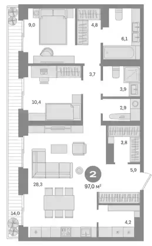В проекте предложено 50 вариантов планировочных решений. На первых и последних этажах — уникальные форматы: с террасами, отдельным входом, двухуровневые. Их всего 126. На последних этажах башен предложены квартиры со вторым светом, несколькими террасами, бассейном, сауной, дымоходом под камин, помещениями под зимний сад. Все квартиры сдаются с подчистовой отделкой.