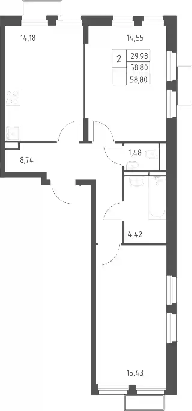 18 507 315 ₽2-к.квартира, 58.8 м², 2 эт.