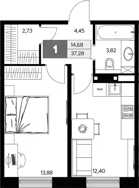 1-к.квартира, 37.28 м², 1 эт. в ЖК Ласточкино Корпус 2