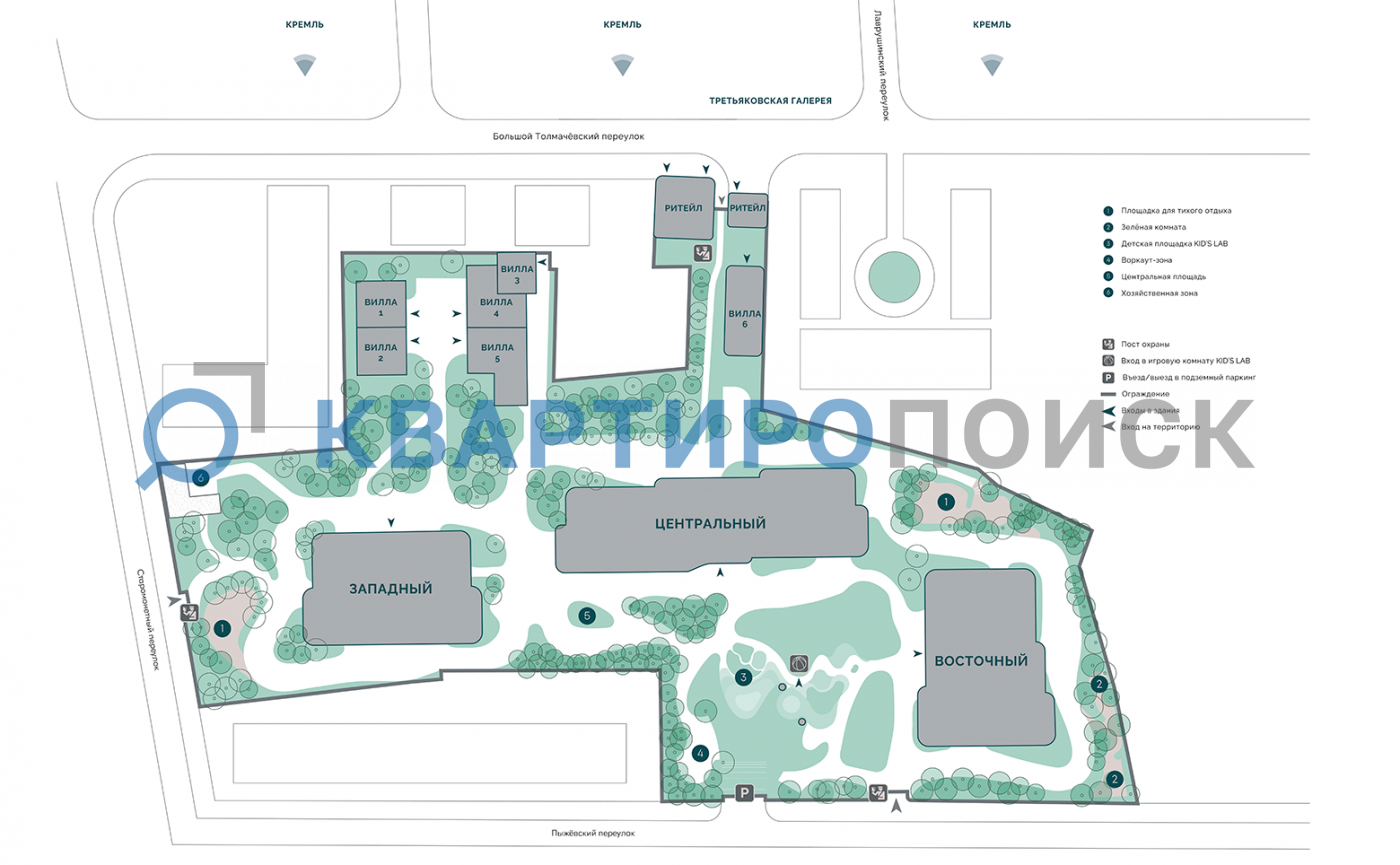 Так же на территории проекта предусмотрена зона для коммерции. Особняки проектировались специально для ритейла, их помещения идеально подходят и для бутика, и для кафе: собственная терраса, высокомощные электрические сети, вывески и большие витрины. Новые особняки расположены в окружении 12 элитных жилых проектов. Это одно из самых популярных туристических мест Москвы — здесь всегда сохраняется высокий пешеходный и автомобильный трафик.