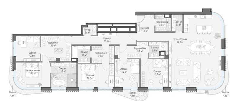 В проекте представлен уникальный выбор роскошных вилл, квартир и пентхаусов с максимальными видовыми характеристиками и каминами. В виллах и пентхаусах — собственные бассейны и террасы. С третьего этажа дома «Лаврушинский» открываются панорамные виды на башни Кремля, Храм Христа Спасителя и исторический центр города. В квартирах предусмотрены: эркеры, панорамное и моллированное остекление.