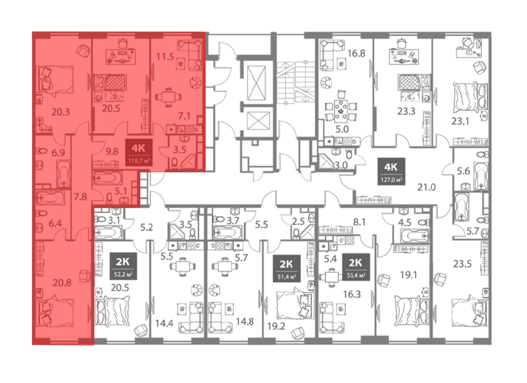 В проекте предложен широкий выбор планировочных решений от 2-х комнатных квартир с кухнями-гостиными до 5-ти комнатных занимающих весь этаж. Все квартиры имеют высокие потолки от 3,1 до 3,6 метра и увеличенные окна. Квартиры сдаются с отделкой White Box. Есть возможность заказать чистовую отделку и меблировку. В каждой секции не более 5 квартир на этаже, что обеспечивает высокий уровень приватности.