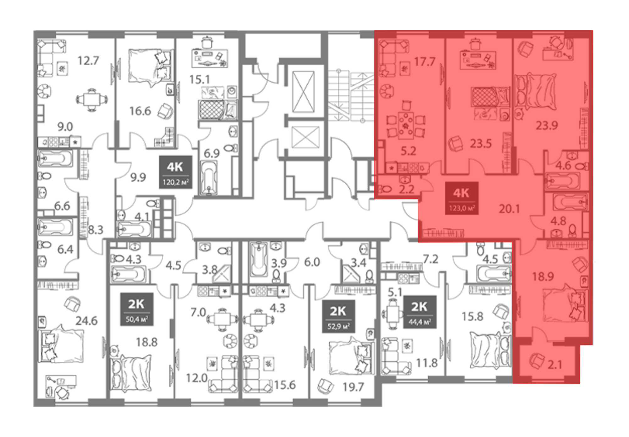 В проекте предложен широкий выбор планировочных решений от 2-х комнатных квартир с кухнями-гостиными до 5-ти комнатных занимающих весь этаж. Все квартиры имеют высокие потолки от 3,1 до 3,6 метра и увеличенные окна. Квартиры сдаются с отделкой White Box. Есть возможность заказать чистовую отделку и меблировку. В каждой секции не более 5 квартир на этаже, что обеспечивает высокий уровень приватности.