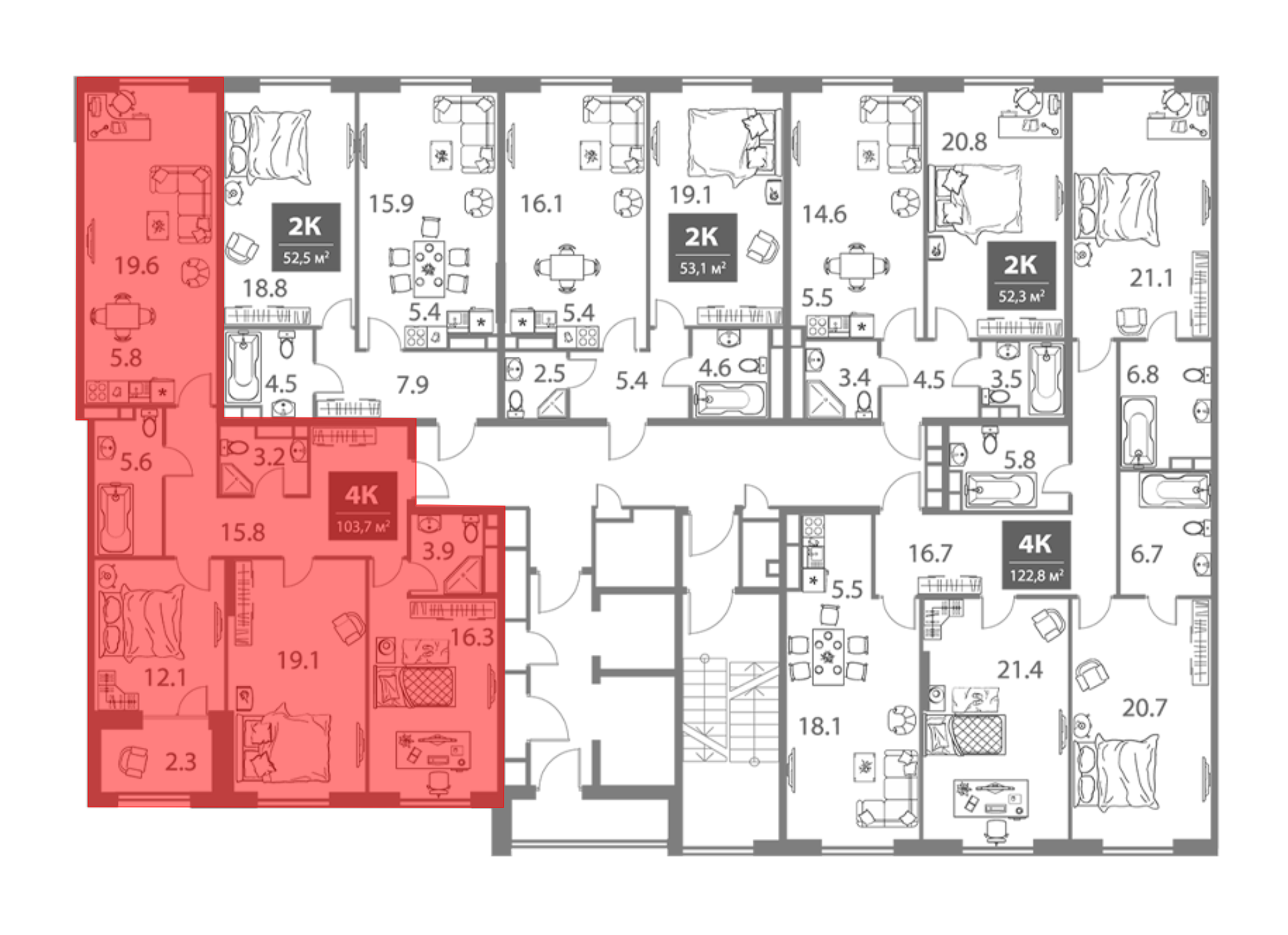 В проекте предложен широкий выбор планировочных решений от 2-х комнатных квартир с кухнями-гостиными до 5-ти комнатных занимающих весь этаж. Все квартиры имеют высокие потолки от 3,1 до 3,6 метра и увеличенные окна. Квартиры сдаются с отделкой White Box. Есть возможность заказать чистовую отделку и меблировку. В каждой секции не более 5 квартир на этаже, что обеспечивает высокий уровень приватности.