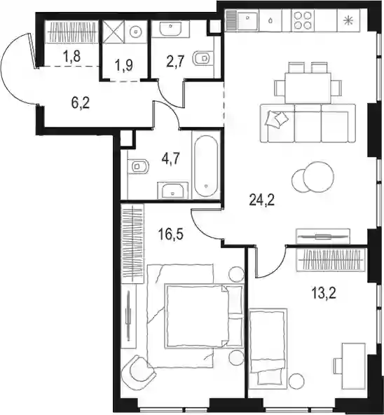 Жилой комплекс включает студии и квартиры от 1 до 4 комнат, включая европланировки с кухней-нишей и всего 3 квартиры с террасами от 5 до 16 кв. м. Площадь лотов варьируется от 28,4 до 120,4 кв. м. В корпусах представлены два формата отделки: white box и без отделки. В white box выполнены стяжка, черновая электрика, звуко- и гидроизоляция, перегородки, штукатурка, подрозетники и выводы под освещение. Возможны объединения квартир и создание индивидуальных планировок.