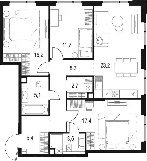 Жилой комплекс включает студии и квартиры от 1 до 4 комнат, включая европланировки с кухней-нишей и всего 3 квартиры с террасами от 5 до 16 кв. м. Площадь лотов варьируется от 28,4 до 120,4 кв. м. В корпусах представлены два формата отделки: white box и без отделки. В white box выполнены стяжка, черновая электрика, звуко- и гидроизоляция, перегородки, штукатурка, подрозетники и выводы под освещение. Возможны объединения квартир и создание индивидуальных планировок.