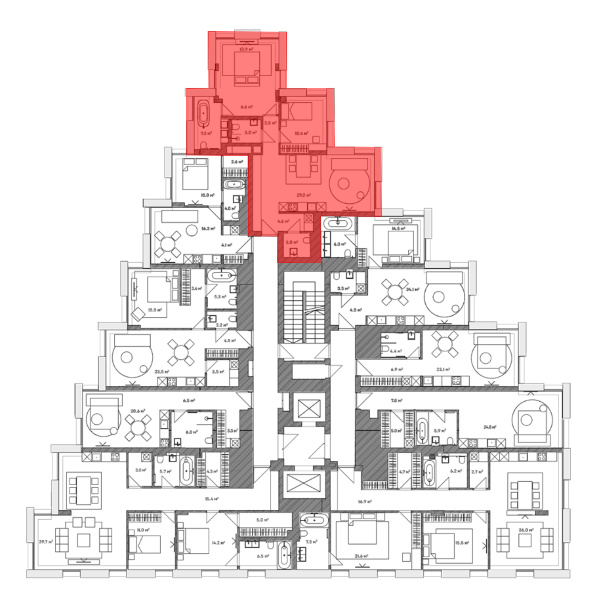 В клубном доме «Lumin» расположено 54 апартамента и 4 пентхауса. Верхние этажи Lumin занимают четыре эксклюзивных пентхауса с каминами, три из которых имеют собственные приватные террасы. Панорамные окна Schuco высотой 2.8 метра в апартаментах и 3 метра в пентхаусах добавляют максимально естественное освещение.