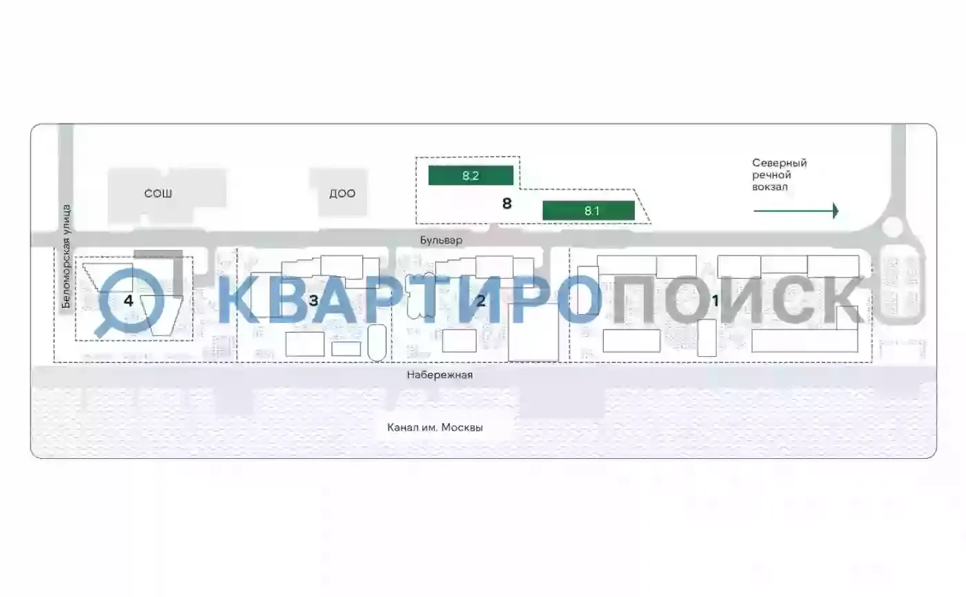 Жилой квартал занимает территорию в 14 гектаров, примыкающую к набережной, парку и историческому зданию Северного речного вокзала. В рамках проекта вдоль набережной будет построено 3 линии жилых домов разной высотности. Всего спроектировано 18 корпусов высотой от 10 до 68 этажей. Архитектурная концепция проекта разработана APEX project bureau.