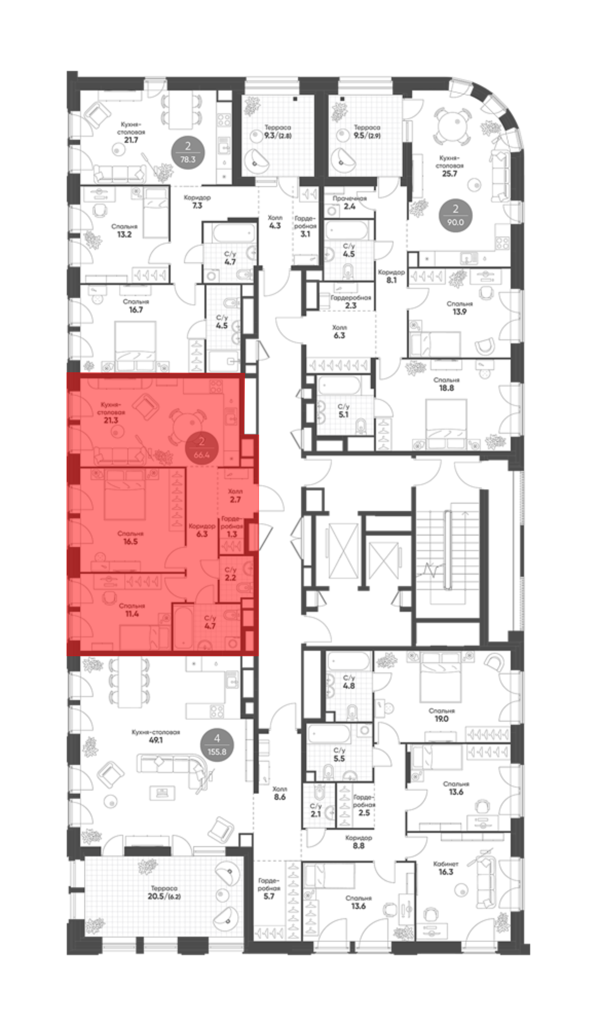 В комплексе представлен широкий выбор планировок квартир с 1–4 спальнями площадью от 40 до 150 кв. метров. Квартиры сдаются без отделки, с высотой потолков от 3 метров, окна — панорамные и увеличенные. В проекте также представлены редкие форматы квартир: пентхаусы с террасами, квартиры с отдельными постирочными, угловым остеклением и несколькими окнами.