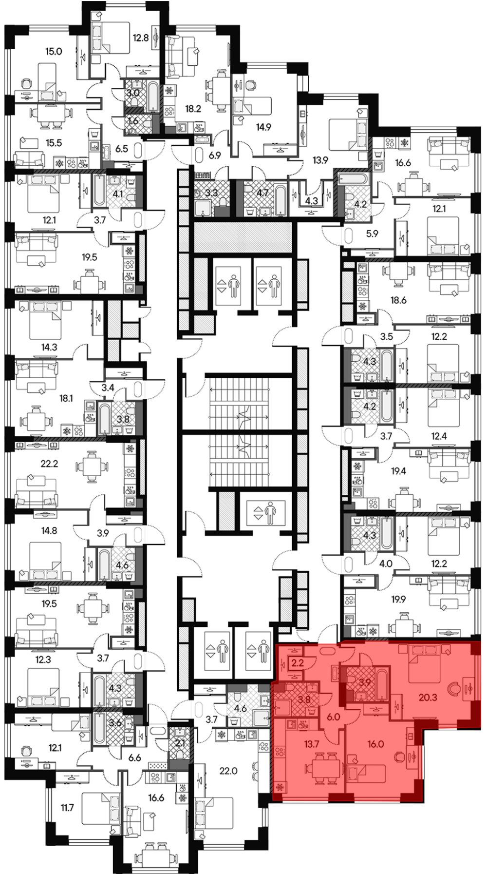 В жилом комплексе предложен широкий выбор планировочных решений: в наличии квартиры как классического типа, так и европланировки. Помимо классических форматов, в комплексе запроектированы квартиры с террасами и двухуровневые пентхаусы. Квартиры сдаются без отделки, высота потолков составляет 3 метра в квартирах и до 5,7 метра в пентхаусах. Все квартиры оснащены увеличенными окнами, в пентхаусах предусмотрено панорамное остекление. Из окон открываются виды на Москву-реку и Музей-заповедник Коломенское.