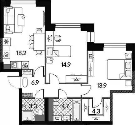 В комплексе «Дмитровское небо»предложено множество планировочных решений: в наличии квартиры, как классического типа, так и европланировки. Сдаются они без стен, высотой потолков 2,7 метра и увеличенными окнами.